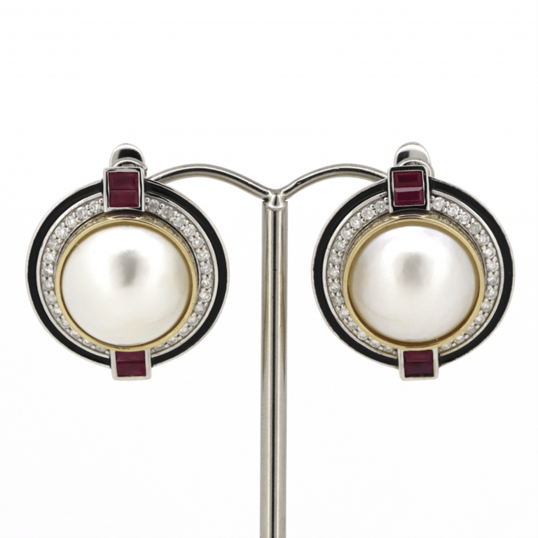 14K WHITE/YELLOW GOLD, WHITE CULTURED MABE PEARL, RUBY AND DIAMOND, HALO EARRINGS. The Designs Feature, 2 Round, White With Pink Overtones, Cultured Mabe Pearls (14.65Mm Size, Good Lustre), Bezel Set. Encompassing The Centres Are, 8 Baguette Cut, Pinkish-Red, Rubies (0.97Ct Tdw, Eye Clean Clarity), Channel Set. Surrounding The Centres Halos Are, 56 Round Brilliant Cut, Diamonds (0.74Ct Tdw, H-K Colour, Si-I2 Clarity), Bead Set. Valuations Provided by an Independent Third-Party Professional Not Directly Associated With Lloyds Auctions at AUD $$24,500.00This valuation has been conducted by an independent third-party professional. The valuation amount is an assessment by the issuing valuer and does not reflect the auction value of the item. Any inquiries regarding the valuation should be directed to the issuing valuer (refer to contact details on the certificate), as Lloyds Auctions has no affiliation or influence over the valuation, the valuer, or the stated amount. Condition: Good - Refer Images 0586122+76