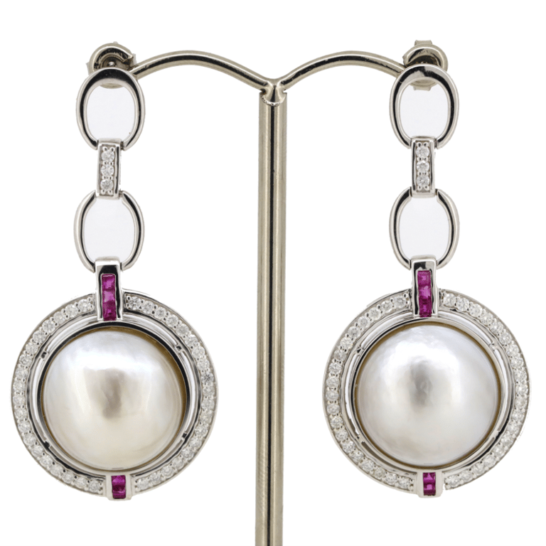 14K YELLOW GOLD, WHITE CULTURED MABE PEARL, RUBY AND DIAMOND, DROP EARRINGS. The Drops Feature, 2 Round Half Dome Round Cabochon Cut, White With Cream Overtones, Cultured Mabe Pearls (24.07Ct Tsw/15.00Mm Size, High Lustre, Minimum Blemishes), Bezel Set. Flanked By, 10 Square French Step Cut, Deep Red, Rubies (0.33Ct Tsw, Slightly Included), Channel Set. Surrounding The Centres In A Halo And Decorating The Drops Are, 82 Round Brilliant Cut, Diamonds (0.84Ct Tdw, H-J Colour, Si-S2 Clarity), Bead Set. The Earrings Feature Post Backs, With 14K White Gold Butterfly Clasps. Valuations Provided by an Independent Third-Party Professional Not Directly Associated With Lloyds Auctions at AUD $$22,000.00This valuation has been conducted by an independent third-party professional. The valuation amount is an assessment by the issuing valuer and does not reflect the auction value of the item. Any inquiries regarding the valuation should be directed to the issuing valuer (refer to contact details on the certificate), as Lloyds Auctions has no affiliation or influence over the valuation, the valuer, or the stated amount. Condition: Good - Refer Images 0586122+63