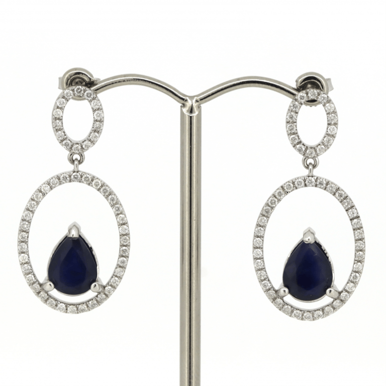 14K WHITE GOLD, BLUE SAPPHIRE AND DIAMOND, DOUBLE HOOP DROP EARRINGS. The Design Features, 2 Pear Cut, Medium Dark Royal Blue, Sapphires (4.15Ct Tsw, Eye Visible Inclusions), 3 Claw Set. Decorating The Centres In Double Oval Hoops Are, 96 Round Brilliant Cut, Diamonds (0.84Ct Tdw, J-K Colour, Si2-I2 Clarity), Claw Set. The Earrings Have Post Backs, With 14K White Gold Butterfly Clasps. Valuations Provided by an Independent Third-Party Professional Not Directly Associated With Lloyds Auctions at AUD $$13,590.00This valuation has been conducted by an independent third-party professional. The valuation amount is an assessment by the issuing valuer and does not reflect the auction value of the item. Any inquiries regarding the valuation should be directed to the issuing valuer (refer to contact details on the certificate), as Lloyds Auctions has no affiliation or influence over the valuation, the valuer, or the stated amount. Condition: Good - Refer Images 0586122+95