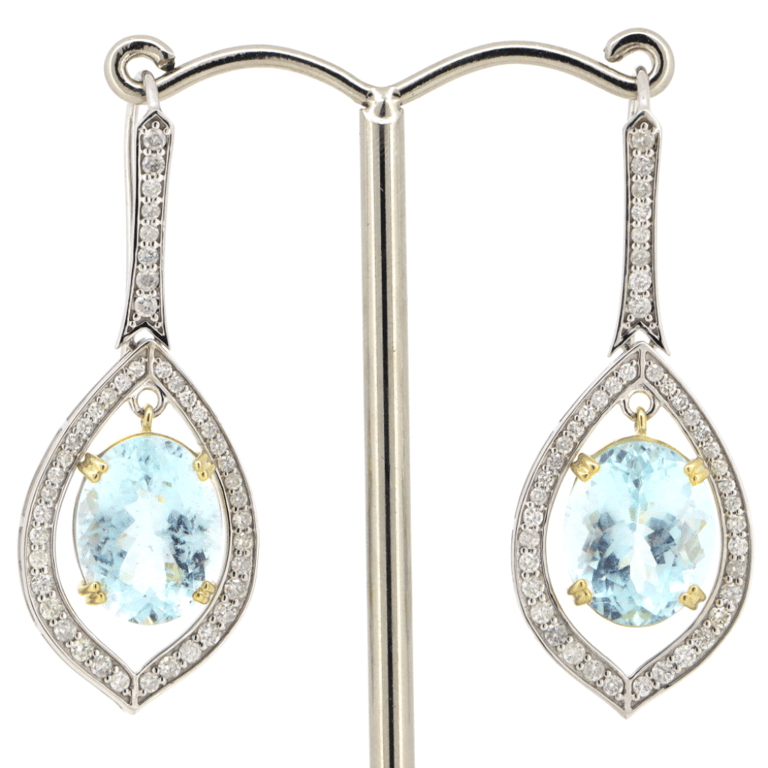 14K WHITE/YELLOW GOLD, AQUAMARINE AND DIAMOND, HALO DROP EARRINGS. The Earrings Feature, 2 Oval Faceted Cut, Light Blue, Aquamarines (9.42Ct Tsw, Light-Moderate Natural Inclusions), Claw Set In Yellow Gold. Encompassing The Centre And Decorating The Hooks Are, 88 Round Brilliant Cut, Diamonds (0.89Ct Tdw, H-J Colour, Si-I2+ Clarity), Bead Set. The Earrings Feature Shepherd Hooks In White Gold. Valuations Provided by an Independent Third-Party Professional Not Directly Associated With Lloyds Auctions at AUD $$16,500.00This valuation has been conducted by an independent third-party professional. The valuation amount is an assessment by the issuing valuer and does not reflect the auction value of the item. Any inquiries regarding the valuation should be directed to the issuing valuer (refer to contact details on the certificate), as Lloyds Auctions has no affiliation or influence over the valuation, the valuer, or the stated amount. Condition: Good - Refer Images 0586122+99