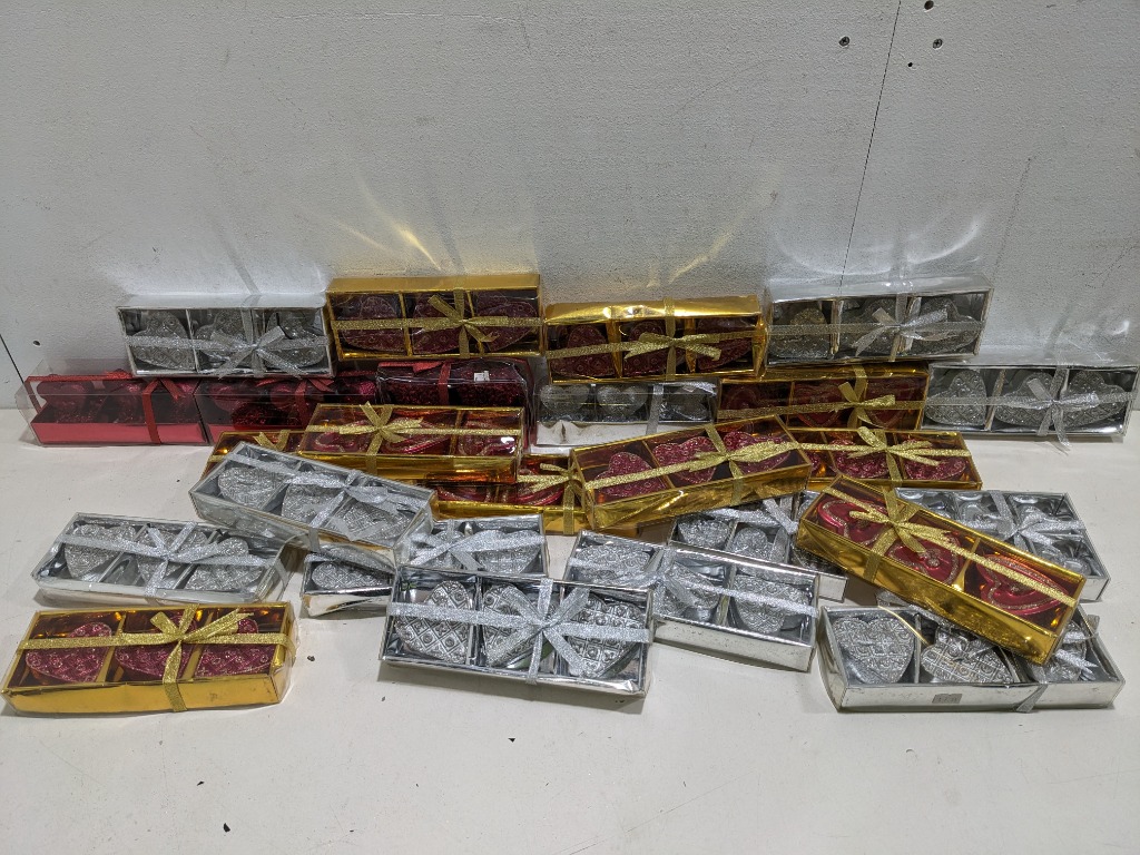 Assorted decorative heart-shaped candles, includes gold, silver and more..