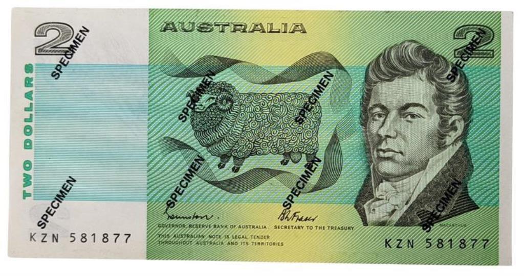 1985 AUSTRALIAN $2 SPECIMEN BANKNOTE SIGNED BY JOHNSTON/FRASER, KZN 581877Condition: Good - Refer To Images