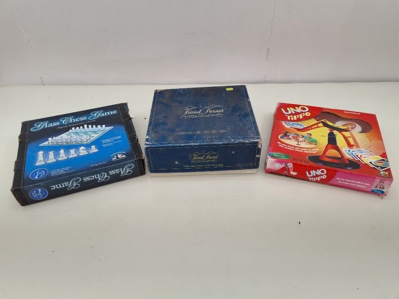 Assorted Retro Board Games, Includes Trivial Pursuit, Glass Chess Set, And Uno TippoSold As Lot