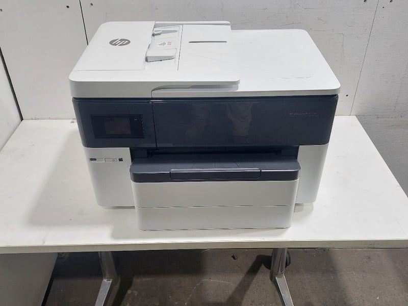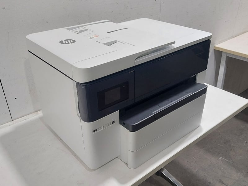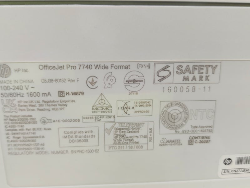 HP OfficeJet Pro 7740 All in one printer.Dims: 38cm H, 48cm W, 58cm D.Model :G5J38ASerial no: CN27A85014Notes:: item untested and signs of wear.