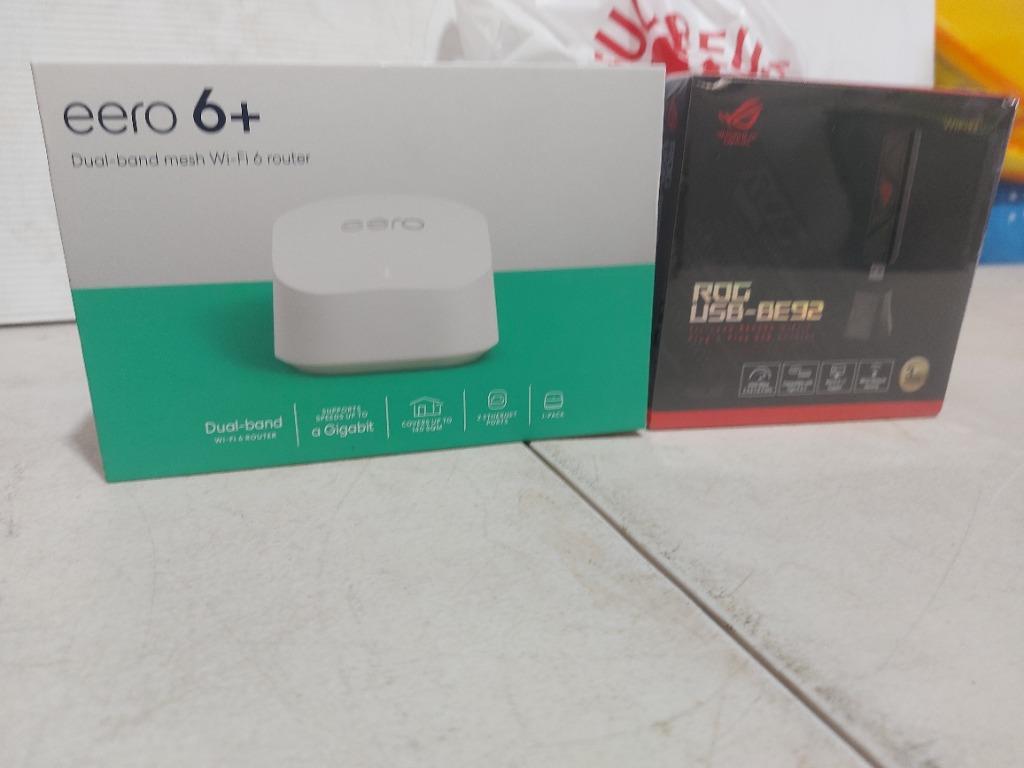 1 x EERO 6+ Dual-band mesh wiFi 6 router 1 pack, RRP$199.00, NEW factory sealed in box, 1 x ROG USB-BE92, tri-band BE6500 WiFi 7, plug & play USB adapter, RRP$169.00, NEW factory sealed in box