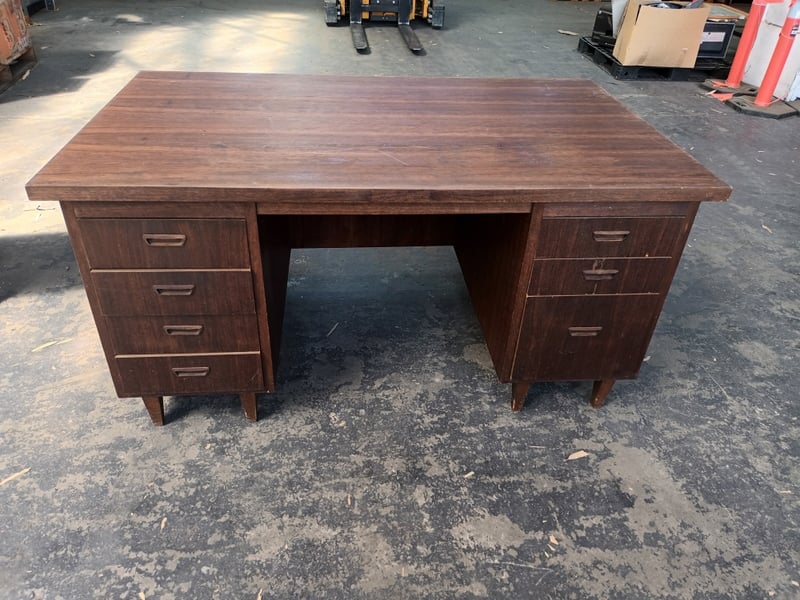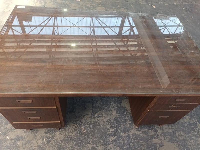 Desk, timber style with glass top with 8 drawers with damaged legH 56cm W 153cm L 99cm