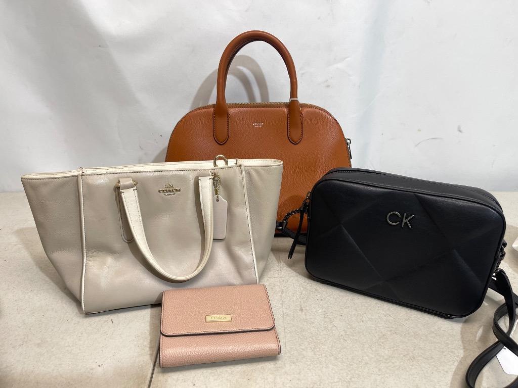 1 x CALVIN KLEIN black quilt camera bag, adjustable crossbody strap, top zip closure, with dust cover, RRP$199.00,NEW with tags,1 x COACH beige handbag, 2 top handles with zip top closure, gold tone hardware, 1 interior zip compartment, 1 x OROTON Tan Leather Hand bag, 2 top handles with top zip closure with gold tone hardware, 1 outer compartment, , beige interior with 1 internal zip compartment, 1 interior phone compartment with tan leather trim, 1 x FURLA salmon pink leather fold over ladies wallet, snap lock closure, gold tone hardware, 1 outer zip coin compartment, 2 note compartments, 4 side compartments, 8 card compartments, in dust cover