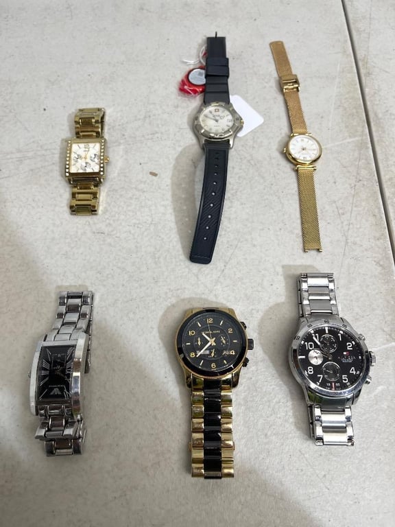 1 x MICHAEL KORS Chronograph mens watch, MK-8265, 1 x HILFIGER Chronograph Watch, black dial with silver tone hourmarkers, stainless steel bracelet with fold over snap lock closure, 1 x SWISS MILITARY Watch with black rubber strap, 1 x FOSSIL ladies gold tone mesh watch, 1 x GUESS Chronograph watch with diamante bezel, 1 x EMPORIO ARMANI Mens Watch