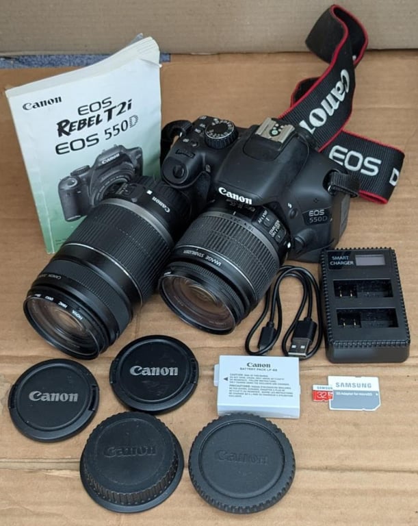 CANON DIGITAL CAMERA T2I EOD 550D LENS 18-55MM 1=3.5-5.6 AND 55-250MM 1=4-5.6, CHARGER, BATTERY, 32GB CARD 586118+4