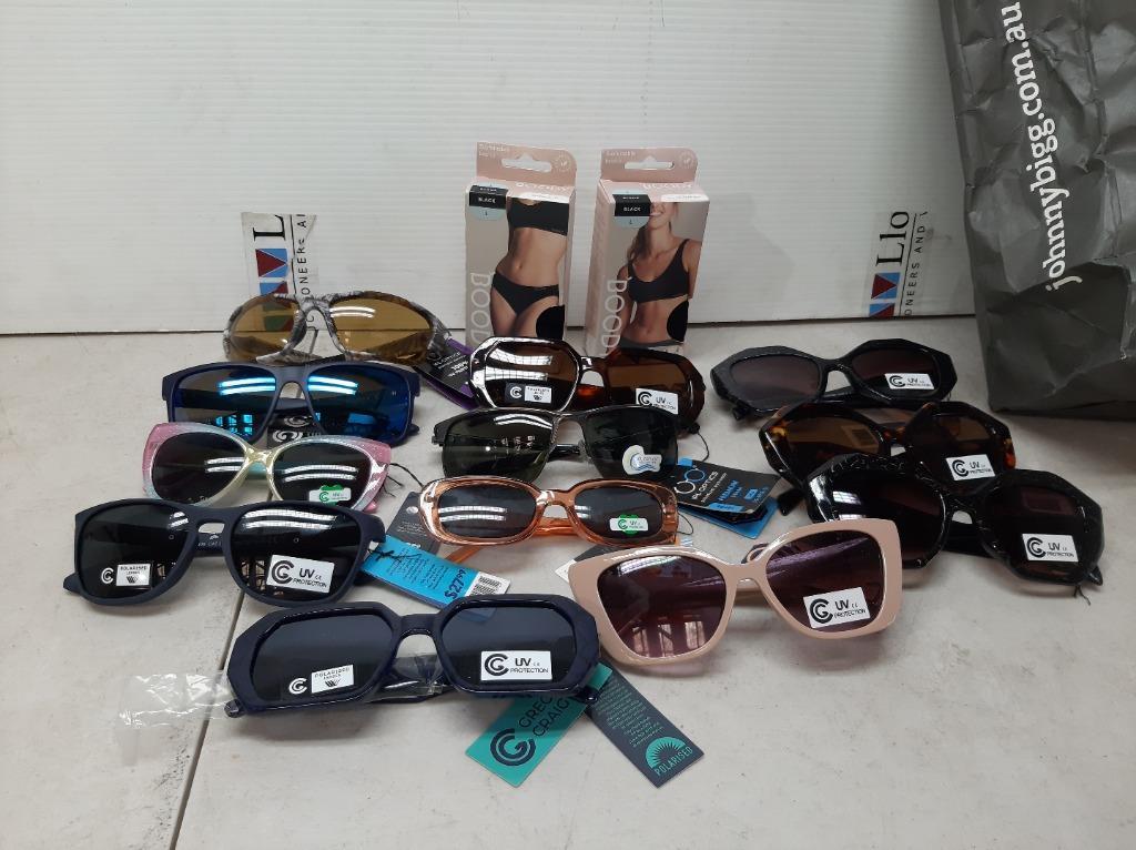8x Adult Gregory Craig UV protection sunglasses NEW with tags, 2x kids Gregory Craig UV protection sunglasses NEW with tags, 2x IPL optic UV protection NEW with tags, 1x BOODY Large black sharper crop bra sustainanble basic, 1x BOODY Large black classic bikini sustainanble basic