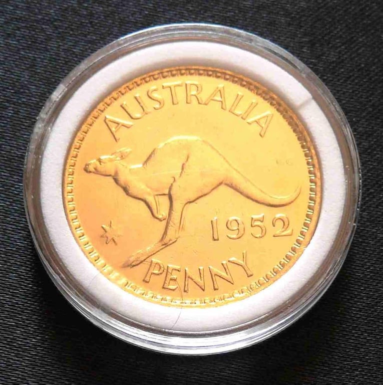 1952 KGVI UNCIRCULATED 18CT. GOLD PLATED AUSTRALIAN PENNY IN PROTECTIVE CLEAR CAPSULE, LST YEAR OF KGVI ERA. 488256+32