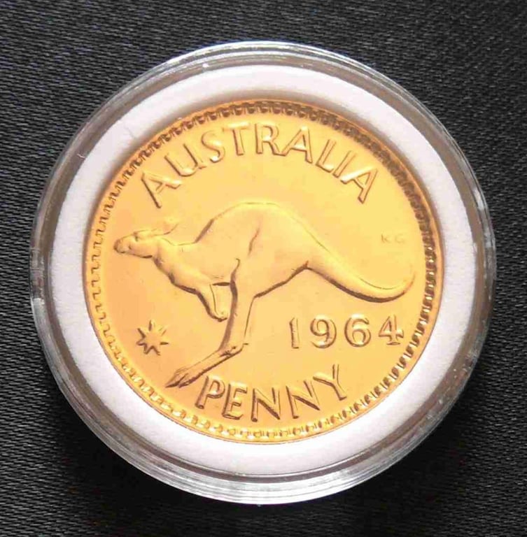 1964 QEII UNCIRCULATED 18CT. GOLD PLATED AUSTRALIAN PENNY IN PROTECTIVE CLEAR CAPSULE, LAST YEAR OF MINTAGE.