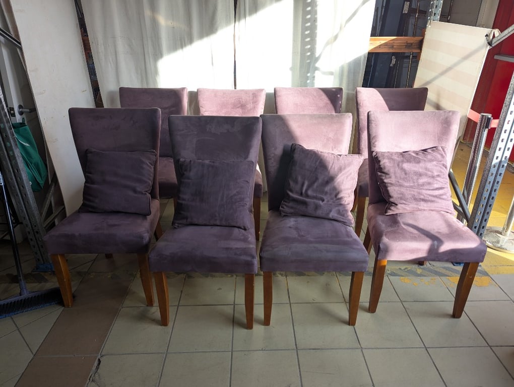 Dining chairs, purple finish suede style upholstery, timber frame, 4 cushions includedNote: general wear and tear, one has loose backingDimensions: H 95cm x W 52cm x D 50cm SOLD AS LOT