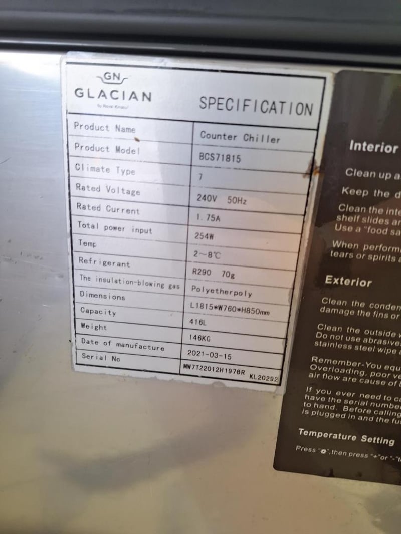 Glacian BCS71815 Undercounter Fridge, Refrigerated, 2 Door, Solid door, 1 Phase, 10 Amp, Stainless Steel, Scratches & Dents, 1815mmW x 760mmD x 860mmH