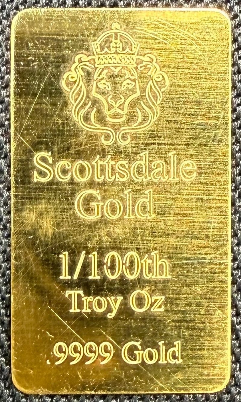 SCOTTSDALE GOLD 1/100TH TROY OZ .9999 GOLD BAR 584892+80