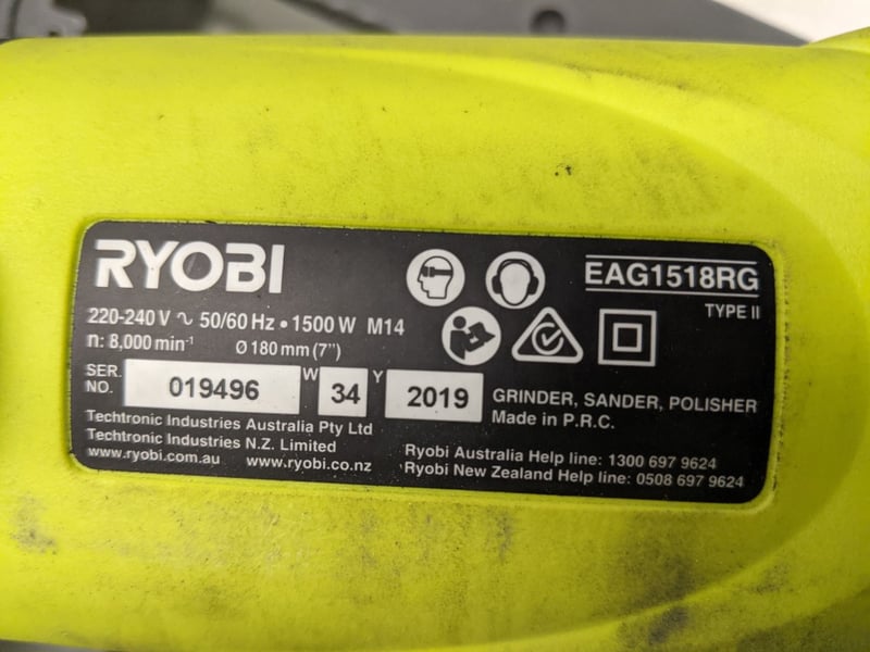Angle Grinder, Ryobi, Electrical, P/N: EAG1518RG, 240VNote: Signs of wear, case has no latch