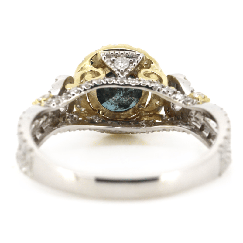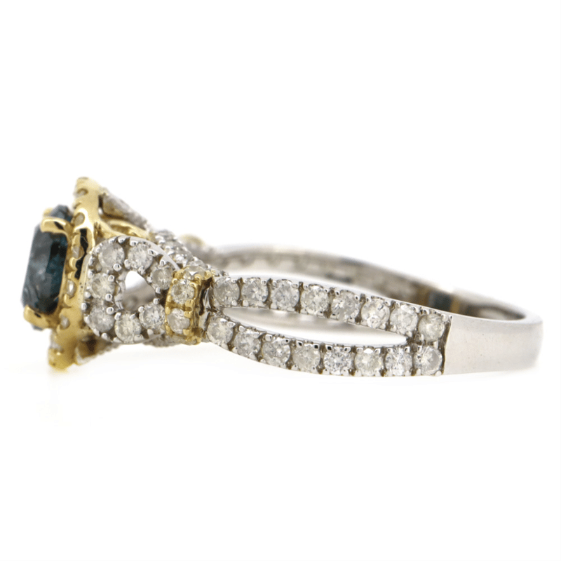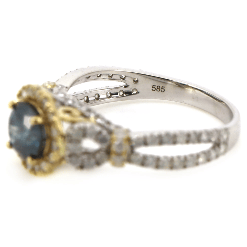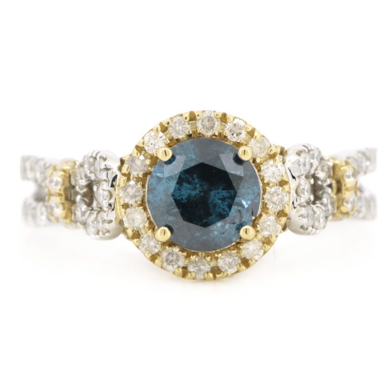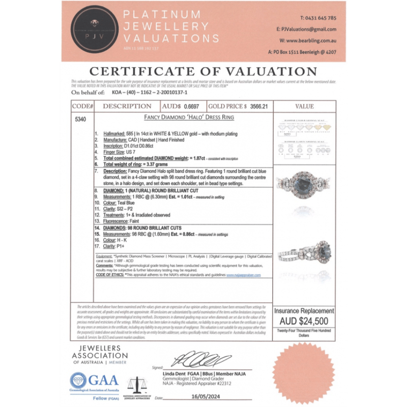14K WHITE/YELLOW GOLD, BLUE DIAMOND, DECORATIVE SPLIT BAND RING. The Centre Features, One Round Brilliant Cut, Teal Blue, Diamond (1.01Ct, Si2-P2 Clarity, Enhanced-Irradiated), Claw Set. Surrounding The Centre In A Halo And Decorating The Band/Setting Are, 98 Round Brilliant Cut, Diamonds (0.86Ct Tdw, H-K Colour, P1+ Clarity), Bead Set. Ring Size O. 14K White/Yellow Gold, Blue Diamond, Decorative Split Band Ring. The Centre Features, One Round Brilliant Cut, Teal Blue, Diamond (1.01Ct, Si2-P2 Clarity, Enhanced-Irradiated), Claw Set. Surrounding The Centre In A Halo And Decorating The Band/Setting Are, 98 Round Brilliant Cut, Diamonds (0.86Ct Tdw, H-K Colour, P1+ Clarity), Bead Set. Ring Size O. Valuations Provided by an Independent Third-Party Professional Not Directly Associated With Lloyds Auctions at AUD $$24,500.00This valuation has been conducted by an independent third-party professional. The valuation amount is an assessment by the issuing valuer and does not reflect the auction value of the item. Any inquiries regarding the valuation should be directed to the issuing valuer (refer to contact details on the certificate), as Lloyds Auctions has no affiliation or influence over the valuation, the valuer, or the stated amount. Condition: Good - Refer Images 0645838+5323