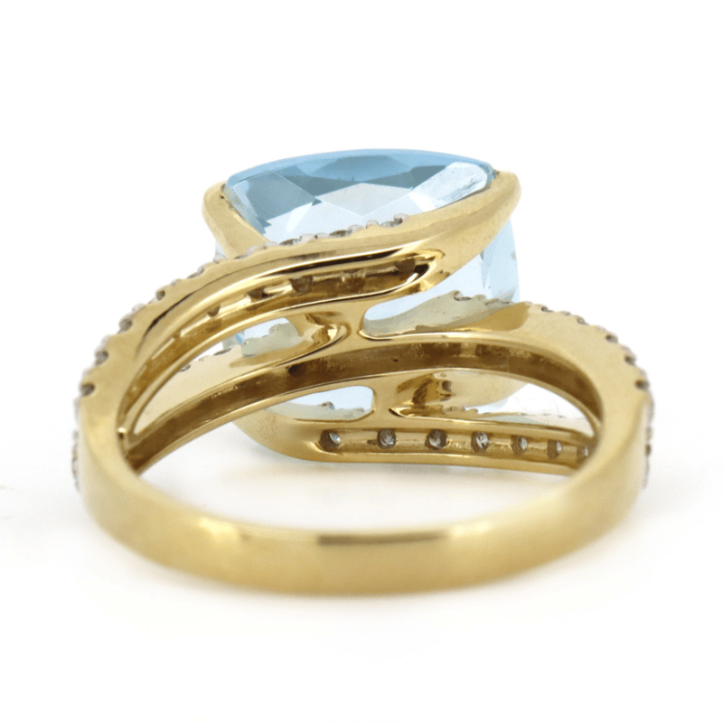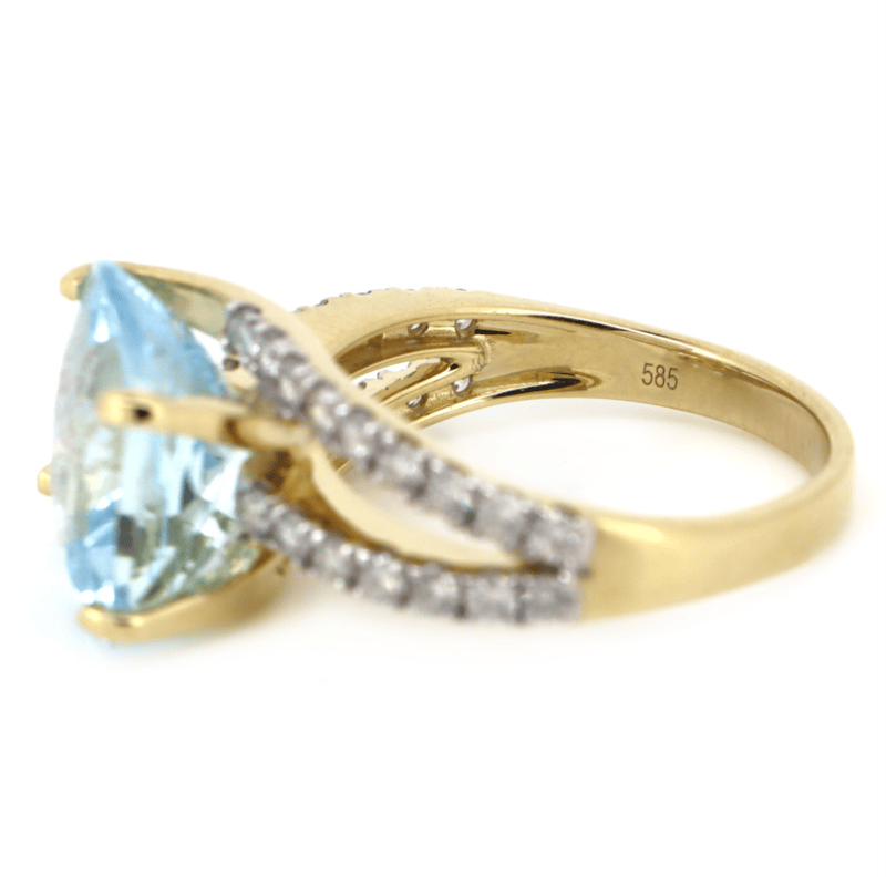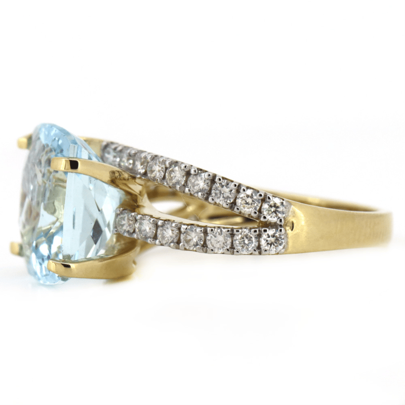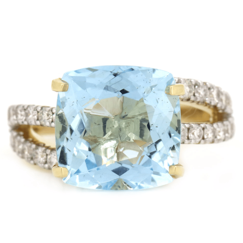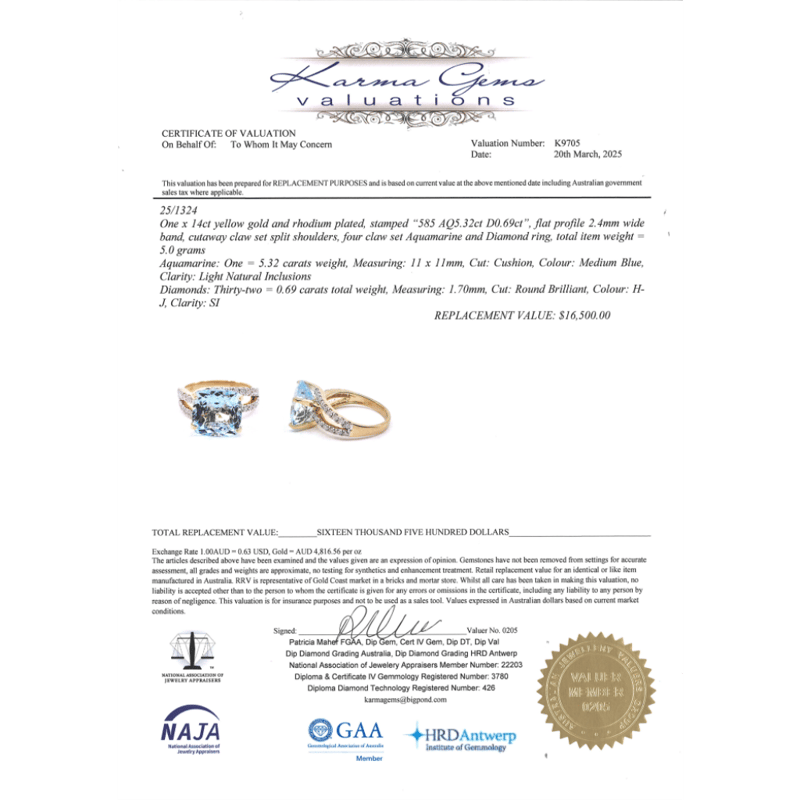 14K YELLOW GOLD, AQUAMARINE AND DIAMOND, SPLIT BAND RING. The Centre Features, One Cushion Cut, Light-Medium Blue, Aquamarine (5.32Ct, Natural Inclusions), 4 Claw Set. Decorating The Split Band Are, 32 Round Brilliant Cut, Diamonds (0.69Ct Tdw, H-J Colour, Si Clarity), Bead Set. Ring Size M. 14K Yellow Gold, Aquamarine And Diamond, Split Band Ring. The Centre Features, One Cushion Cut, Light-Medium Blue, Aquamarine (5.32Ct, Natural Inclusions), 4 Claw Set. Decorating The Split Band Are, 32 Round Brilliant Cut, Diamonds (0.69Ct Tdw, H-J Colour, Si Clarity), Bead Set. Ring Size M. Valuations Provided by an Independent Third-Party Professional Not Directly Associated With Lloyds Auctions at AUD $$16,500.00This valuation has been conducted by an independent third-party professional. The valuation amount is an assessment by the issuing valuer and does not reflect the auction value of the item. Any inquiries regarding the valuation should be directed to the issuing valuer (refer to contact details on the certificate), as Lloyds Auctions has no affiliation or influence over the valuation, the valuer, or the stated amount. Condition: Good - Refer Images 0645838+5379