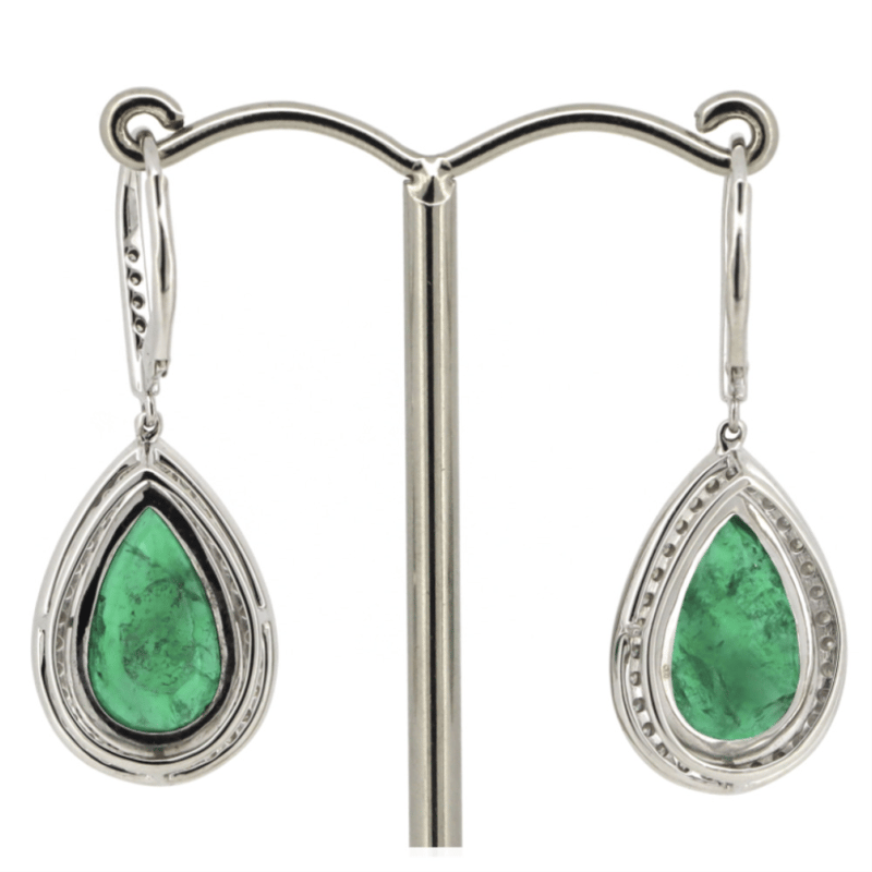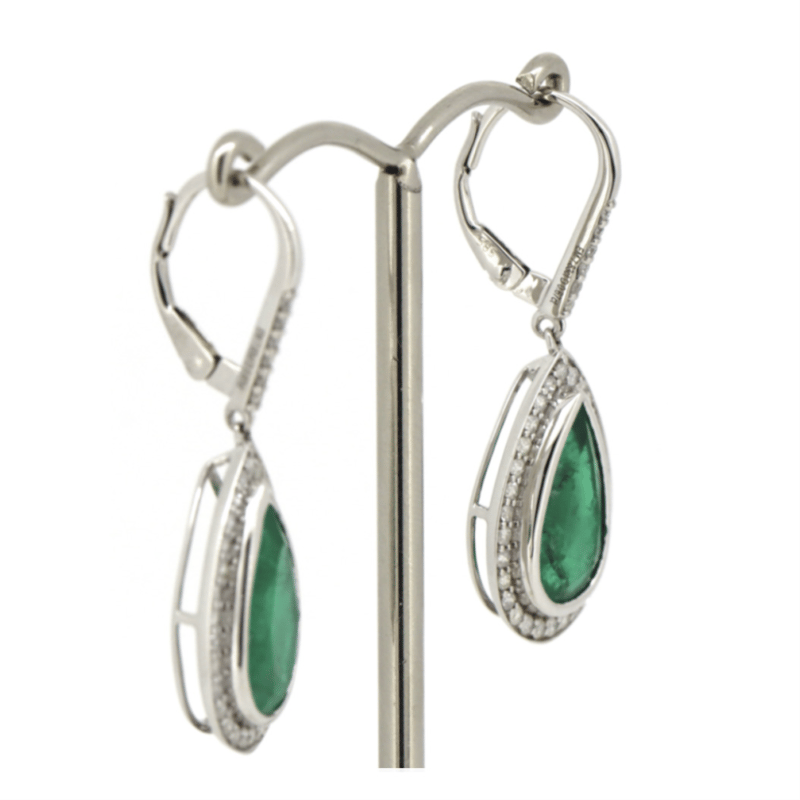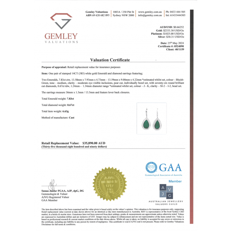 14K WHITE GOLD, EMERALD AND DIAMOND, HALO DROP EARRINGS. The Centres Feature, 2 Pear Cut, Medium Bluish-Green, Emeralds (7.83Ct Tsw, Moderate Eye Visible Inclusions), Bezel Set. Surrounding The Centres In Halos Are, 76 Round Brilliant Cut, Diamonds (0.67Ct Tdw, J-K Colour, Si2-I2 Clarity), Bead Set. The Earrings Feature Lever Back Closures. 14K White Gold, Emerald And Diamond, Halo Drop Earrings. The Centres Feature, 2 Pear Cut, Medium Bluish-Green, Emeralds (7.83Ct Tsw, Moderate Eye Visible Inclusions), Bezel Set. Surrounding The Centres In Halos Are, 76 Round Brilliant Cut, Diamonds (0.67Ct Tdw, J-K Colour, Si2-I2 Clarity), Bead Set. The Earrings Feature Lever Back Closures. Valuations Provided by an Independent Third-Party Professional Not Directly Associated With Lloyds Auctions at AUD $$35,890.00This valuation has been conducted by an independent third-party professional. The valuation amount is an assessment by the issuing valuer and does not reflect the auction value of the item. Any inquiries regarding the valuation should be directed to the issuing valuer (refer to contact details on the certificate), as Lloyds Auctions has no affiliation or influence over the valuation, the valuer, or the stated amount. Condition: Good - Refer Images 0645838+5356