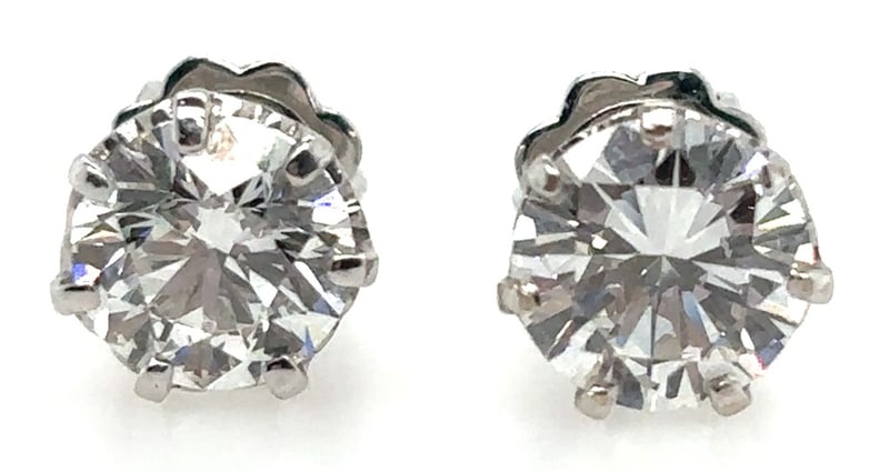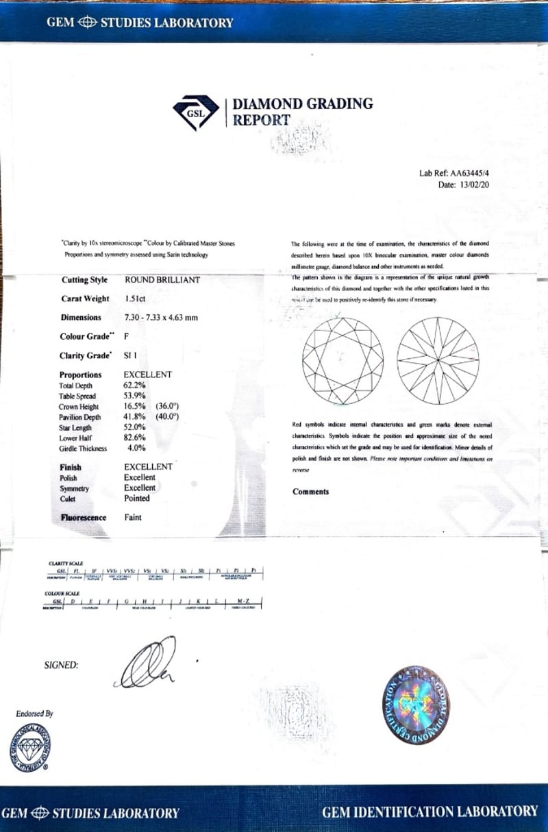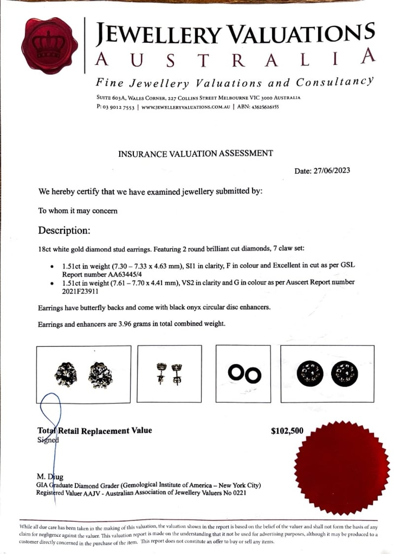 18CT WHITE GOLD DIAMOND STUD EARRINGS New Pair Featuring 2 Round Brilliant Cut Diamonds, 7 Claw Set: 1.51Ct In Weight (7.30-7.33 X 4.63 Mm), Si1 In Clarity, F In Colour And Excellent In Cut As Per Gsl Report Number Aa63445/4 • 1.51Ct In Weight (7.61-7.70 X 4.41 Mm), Vs2 In Clarity And G In Colour As Per Auscert Report Number 2021F23911 Earrings Have Butterfly Backs And Come With Black Onyx Circular Disc Enhancers. Total Item Weight: 3.96g Condition: Good - Refer To Images This valuation has been conducted by an independent third-party professional. The valuation amount is an assessment by the issuing valuer and does not reflect the auction value of the item. Any inquiries regarding the valuation should be directed to the issuing valuer (refer to contact details on the certificate), as Lloyds Auctions has no affiliation or influence over the valuation, the valuer, or the stated amount. Insurance Replacement Valuation Amount: $102,500.00 CROSSDOCK 162827+5