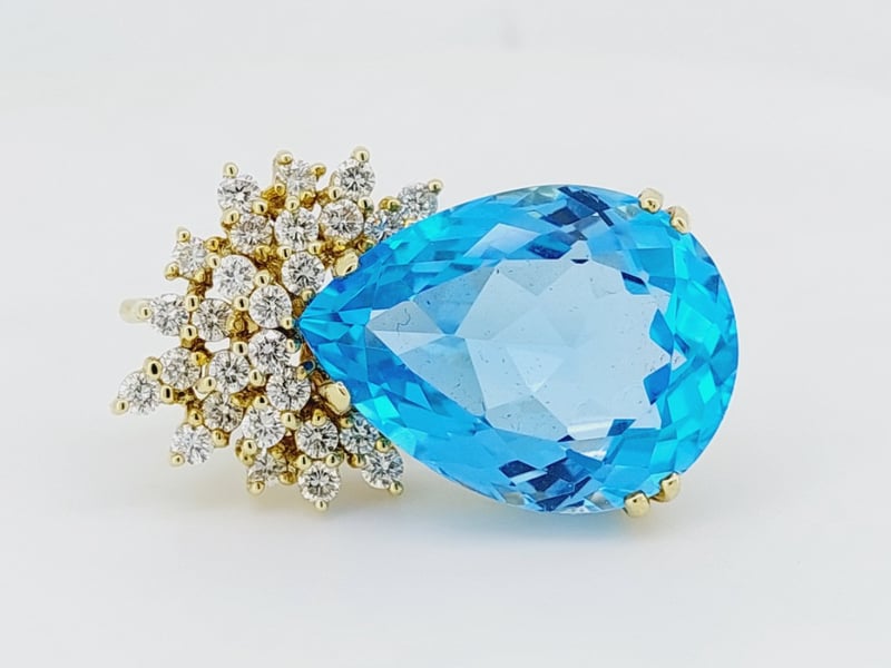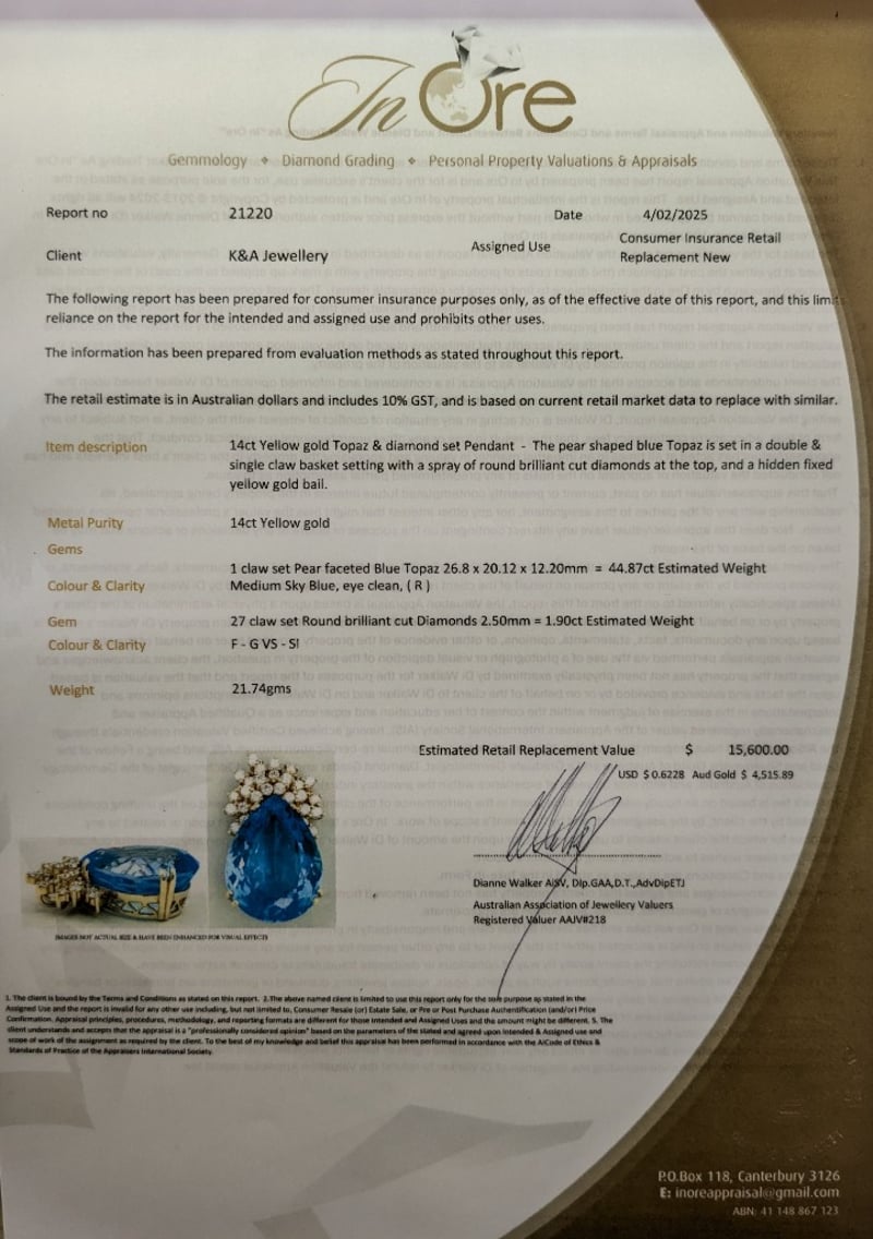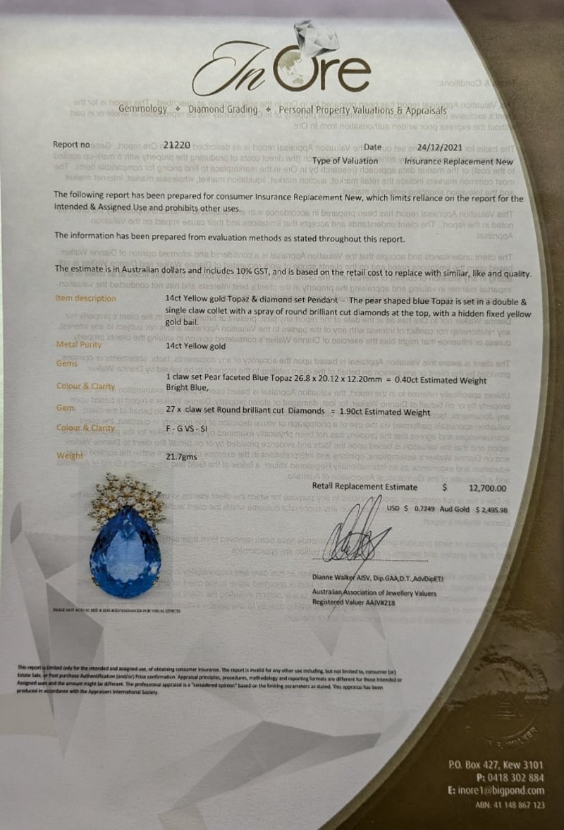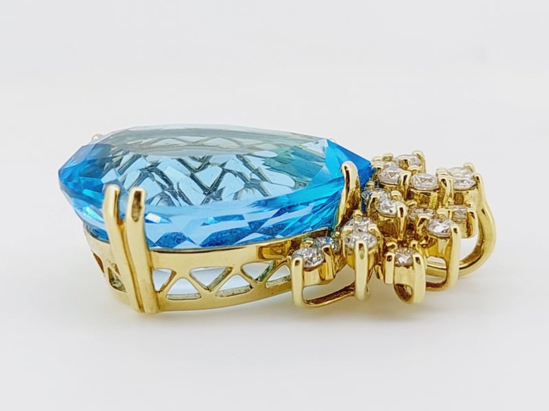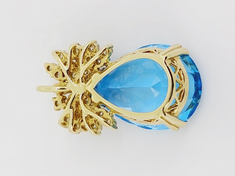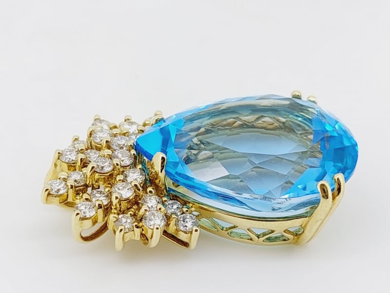 14K YELLOW GOLD TOPAZ AND DIAMOND PENDANTThe Pear Shaped Blue Topaz Is Set In A Double & Single Claw Basket Setting With A Spray Of Round Brilliant Cut Diamonds At The Top, And A Hidden Fixed Yellow Gold Bail.Total Item Weight: 21.74gCondition: Good - Refer To ImagesThis valuation has been conducted by an independent third-party professional. The valuation amount is an assessment by the issuing valuer and does not reflect the auction value of the item.Any inquiries regarding the valuation should be directed to the issuing valuer (refer to contact details on the certificate), as Lloyds Auctions has no affiliation or influence over the valuation, the valuer, or the stated amount.Insurance Replacement Valuation Amount: $15,600.00CROSSDOCK162949+24