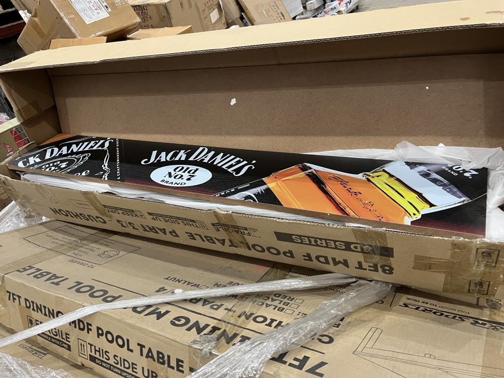 Pallet of pool table components including cushions for Jack Daniels table