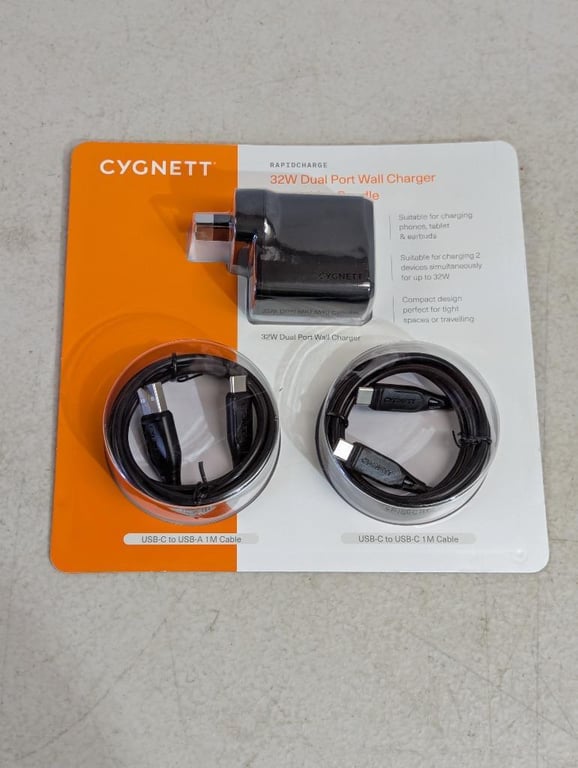 RRP $39 Cygnett Rapidcharge 32W Dual Port Wall Charger & 2 Cables Bundle, Black