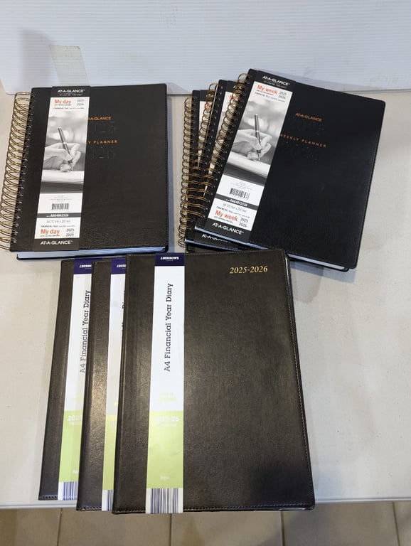 A4 25/26 Financial Year Diaries, Various Styles AAG4072526 x 3 JB4WEXF25B x 3 AAG4D12526 x 1 SOLD AS LOT