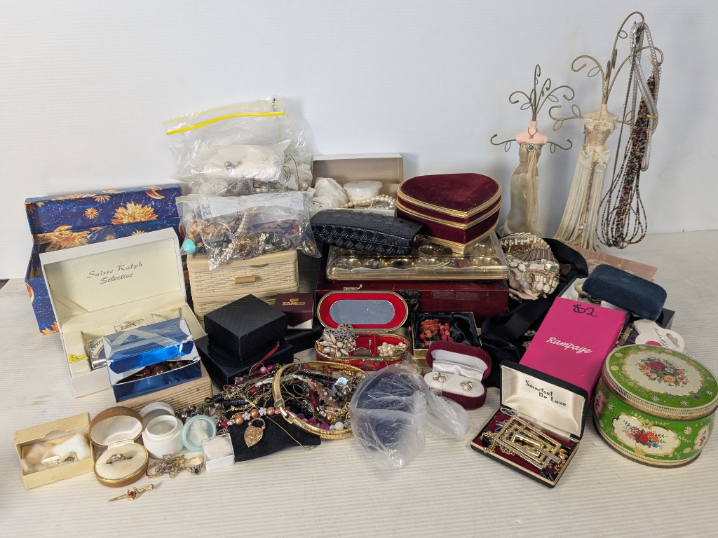 Jewellery includes 8CT stamped ring with gems, 9CT stamped brooch, necklaces, clip-on earrings, jewellery boxes and more Sold as lot
