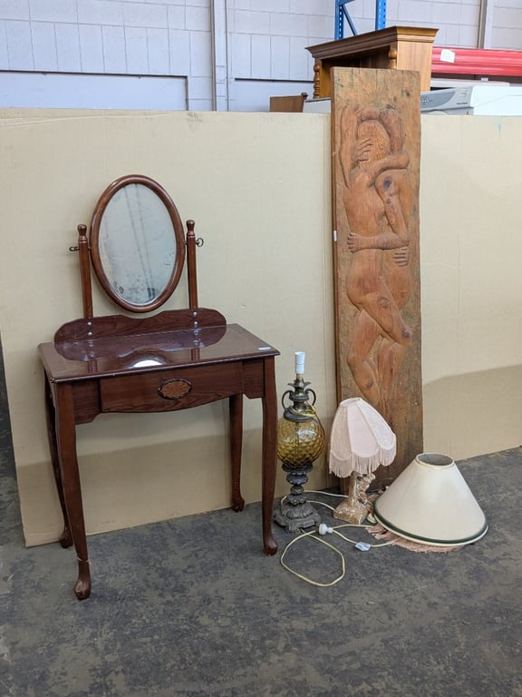 Homewares, including carved timber artwork, 3 x lamps and dressing table with mirror