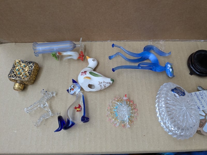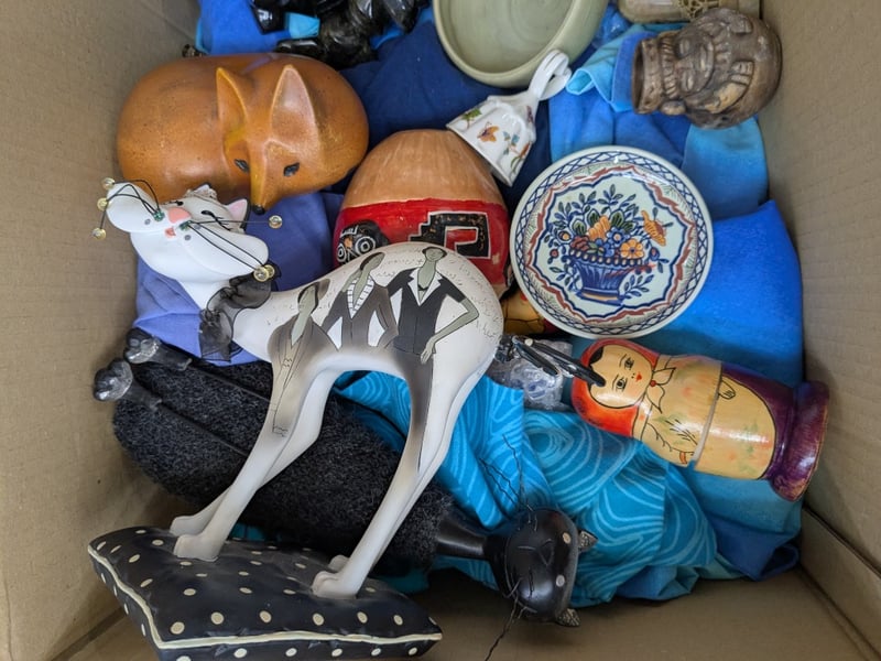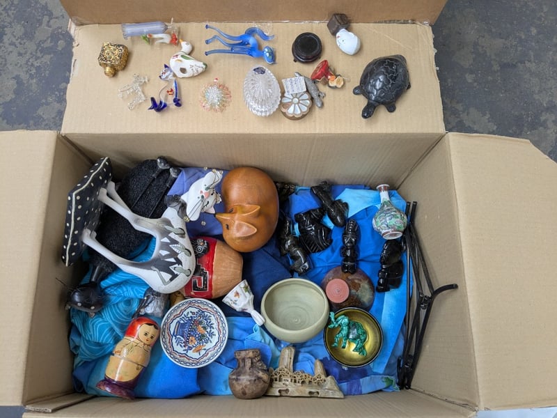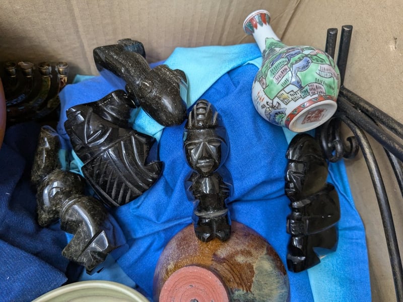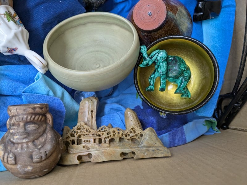 Ornaments, including carved stone pieces, nesting dolls, vases/ bowls and more Sold as lot