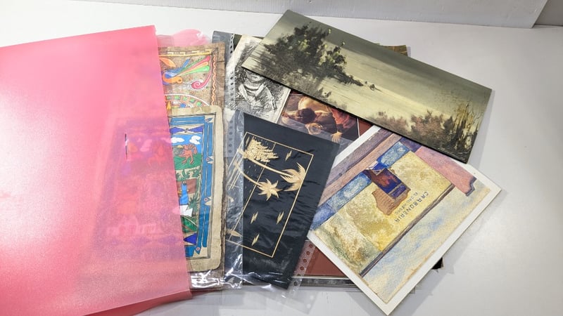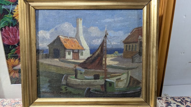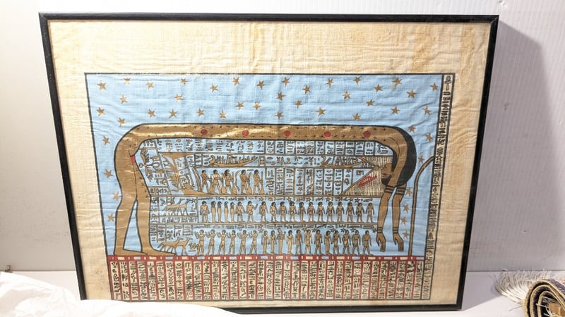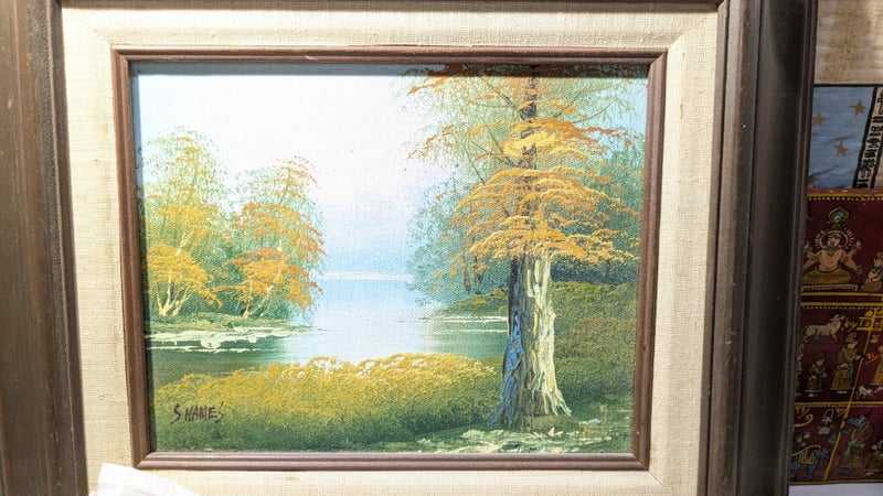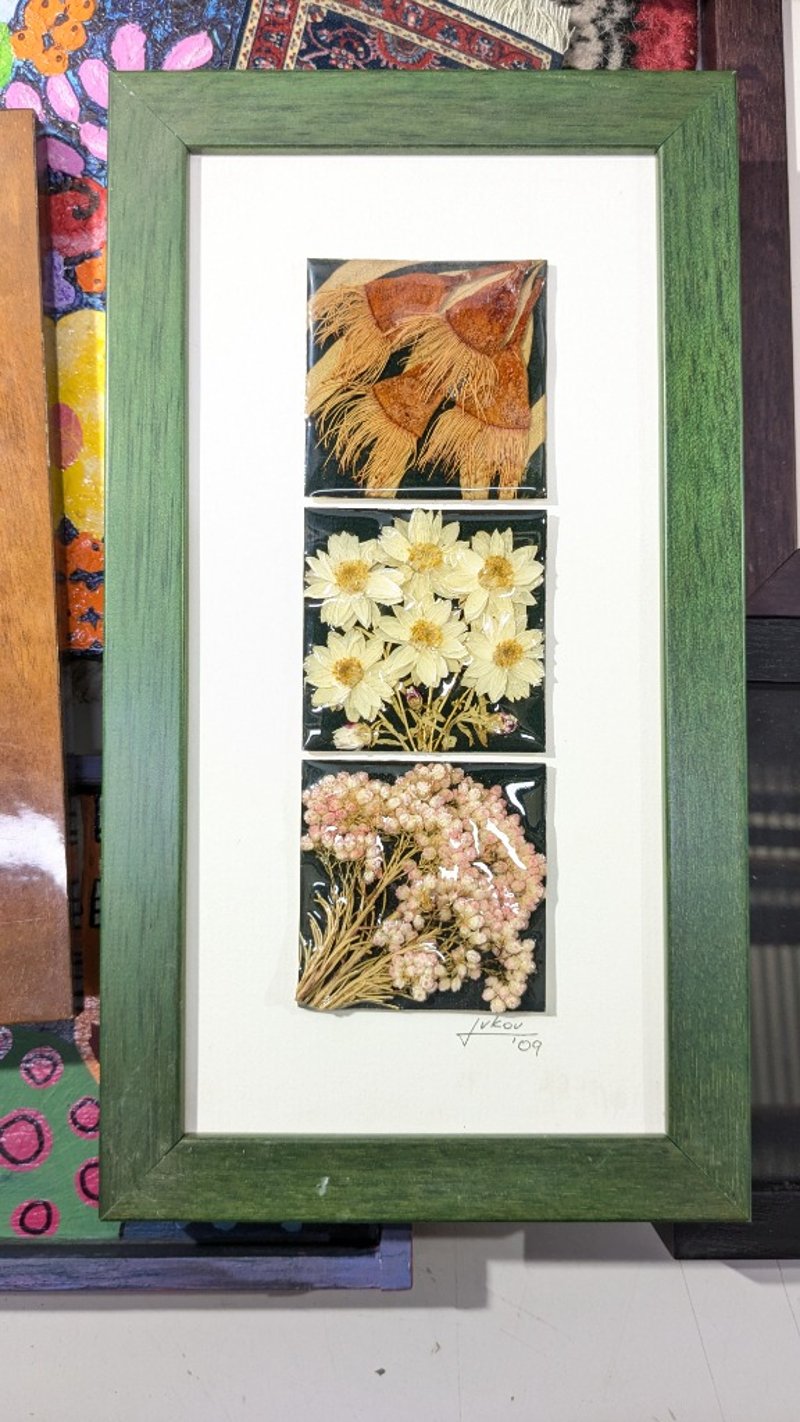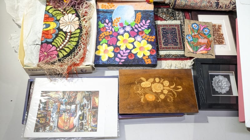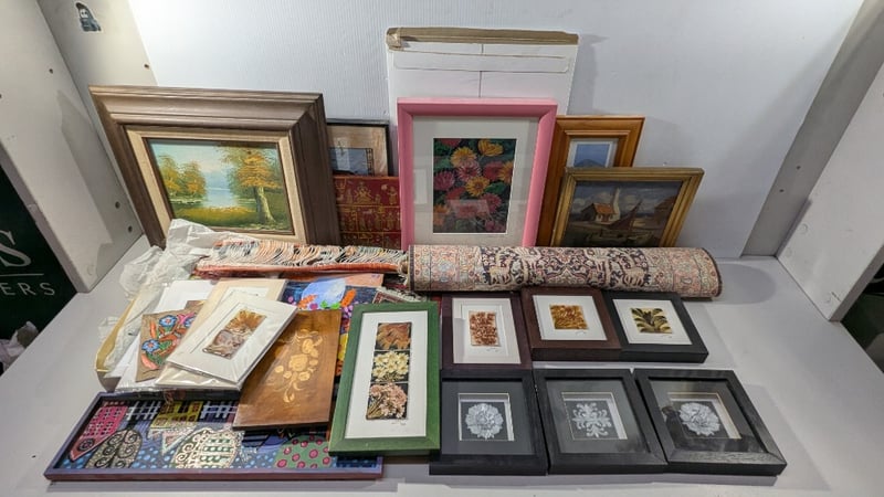Artwork, including small framed paintings, rugs, botanical art, and more