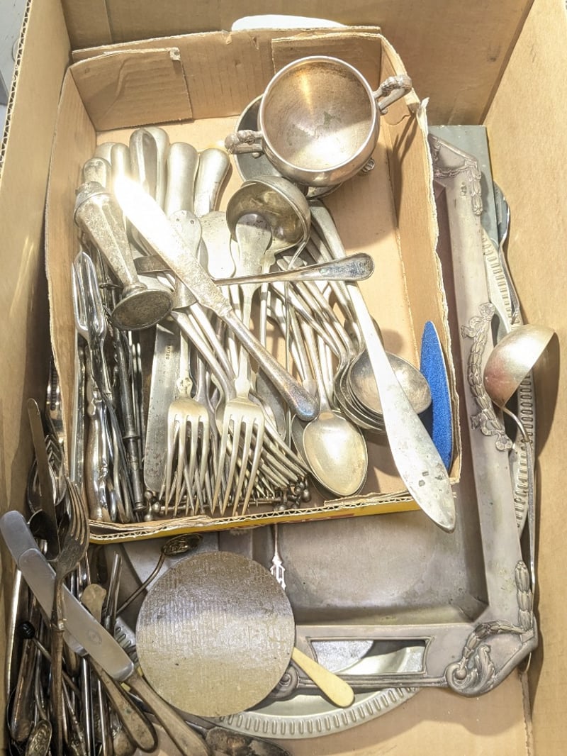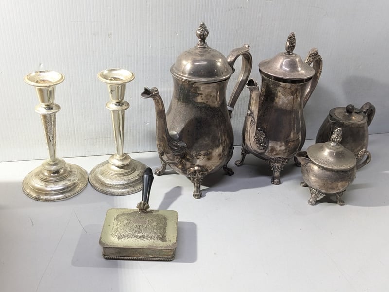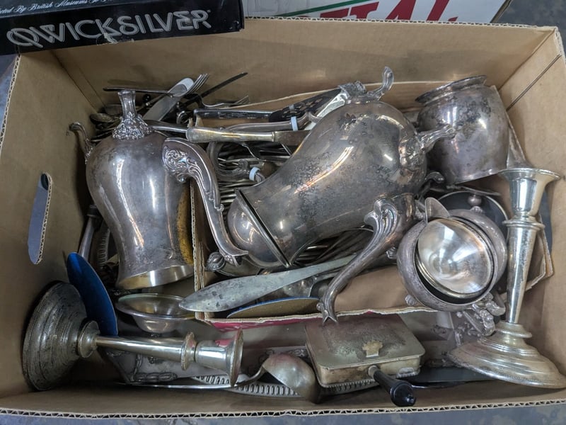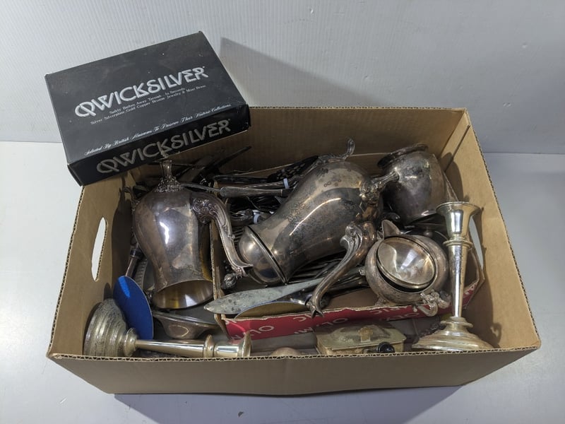 Kitchenware, silver style pieces including cutlery, candle holders and more Sold as lot