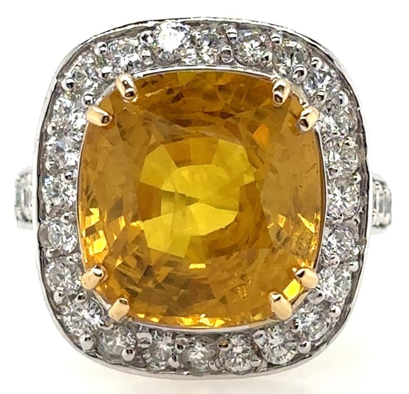 18CT YELLOW AND WHITE GOLD SAPPHIRE AND DIAMOND RING Total Item Weight: 10.49gms This 18Ct White Gold Ring Features 1 X 11.75Ct Cushion Cut Claw Set Sapphire, Measuring 12.9Mm X 12.2Mm X 8Mm And Heat Treated Yellow In Colour With 28 X Round Brilliant Cut Diamonds Set Around The Centre Stone And Down The Shoulders Of The Ring, 1.32Ct In Total Combined Weight, Vs-Si In Clarity And F In Colour. Jewellery Valuations Provided By A Third Party Professional Not Directly Associated With Lloyds Auctions at AUD $32000This Insurance Valuation has been provided by a registered Jewellery Valuer and is intended for insurance purposes only. The valuation amount has no bearing on the auction value of the item. Any questions regarding the valuation should be directed to the issuing Valuer (refer to contact details on the certificate) as Lloyds have no association or relationship with the Valuer or the valuation amount contained within the valuation. Condition: Excellent- Refer Images 0162901+169CROSSDOCK