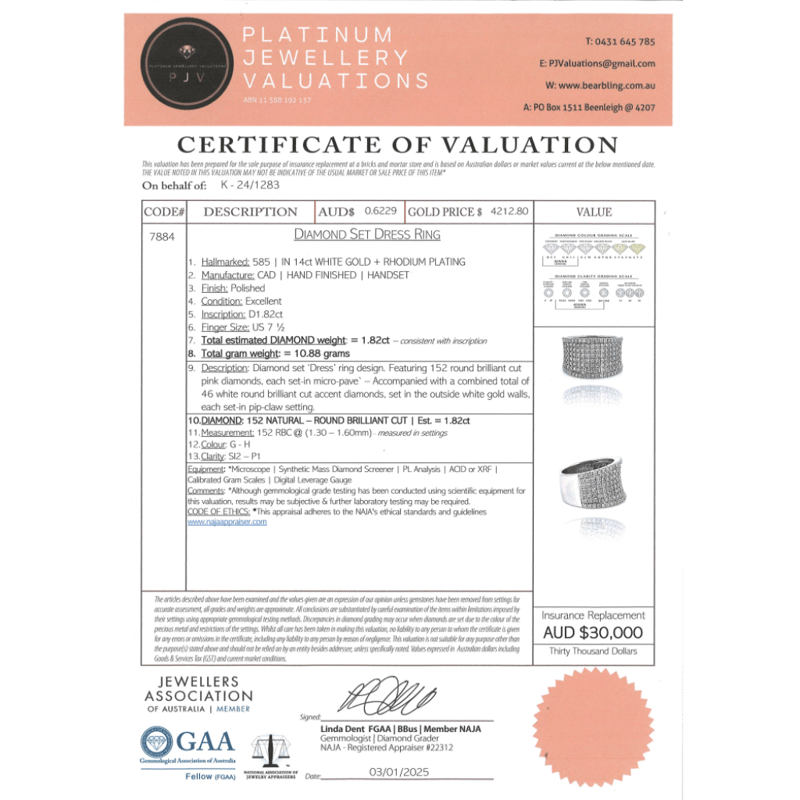 14K WHITE GOLD, 1.82 TDW DIAMOND, CLUSTER RING. The Design Features, 152 Round Brilliant Cut, Diamonds (1.82Ct Tdw, G-H Colour, Si2-P1 Clarity), Micro-Pave/Pip-Claw Set. Ring Size N 1/2. 14K White Gold, 1.82 Tdw Diamond, Cluster Ring. The Design Features, 152 Round Brilliant Cut, Diamonds (1.82Ct Tdw, G-H Colour, Si2-P1 Clarity), Micro-Pave/Pip-Claw Set. Ring Size N 1/2. Valuations Provided by an Independent Third-Party Professional Not Directly Associated With Lloyds Auctions at AUD $$30,000.00This valuation has been conducted by an independent third-party professional. The valuation amount is an assessment by the issuing valuer and does not reflect the auction value of the item. Any inquiries regarding the valuation should be directed to the issuing valuer (refer to contact details on the certificate), as Lloyds Auctions has no affiliation or influence over the valuation, the valuer, or the stated amount. Condition: Good - Refer Images 0645838+5342