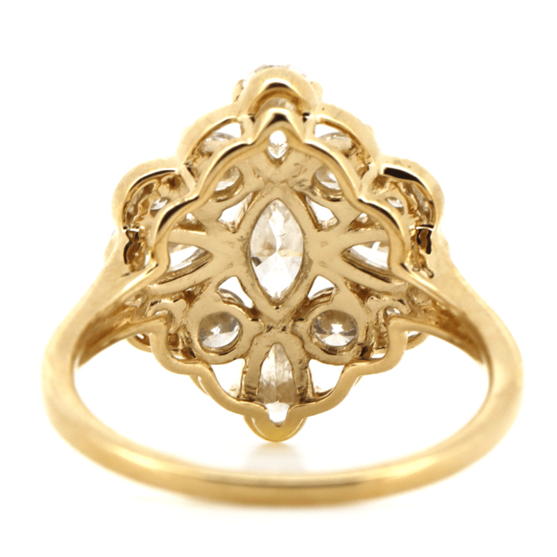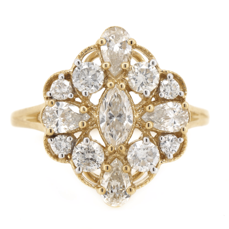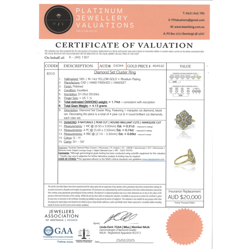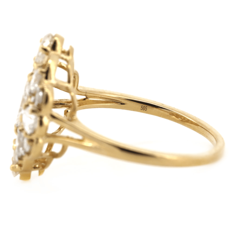 14K Yellow Gold And Diamond, Cluster Ring. The Centre Features, One Marquise Cut, Diamond (0.31Ct, G-H Colour, Si1-Si2 Clarity), Bezel Set. Encompassing The Centre Are, 4 Pear Cut And 4 Round Brilliant Cut, Diamonds (1.43Ct Tdw, G-H Colour, Si1-Si2 Clarity), Claw Set. Ring Size O.