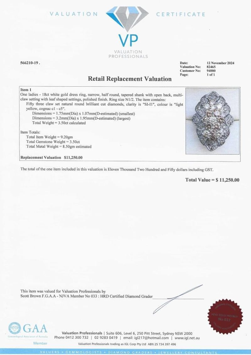 3.50 Carats Diamond 18Ct White Gold Dress Ring, Narrow, Half Round, Tapered Shank With Open Back, Multi-Claw Setting With Leaf Shaped Settings, Polished Finish. Ring Size N1/2. The Item Contains: