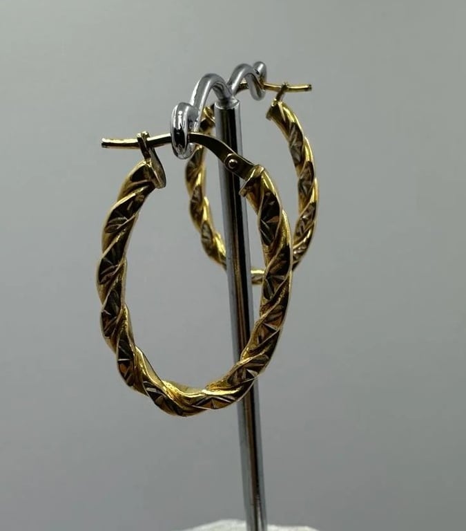 9K YELLOW GOLD EARRINGS. SILVER FILLEDTwist Style Hoop Earrings. Continental Style Clip Measurements: 28Mm Long X 19Mm Wide. 2.7Mm Thick. 3.29Grams TotalCondition: Good - Refer To ImagesCROSSDOCK162955+31
