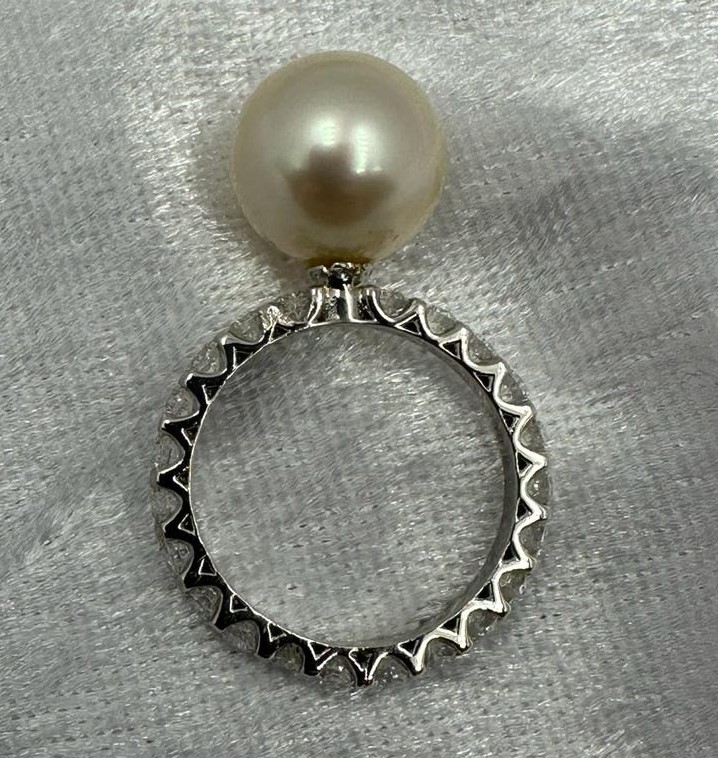 PLATINUM 950 SHARED CLAW DIAMOND BAND RING WITH A 12MM ROUND AUSTRALIAN SOUTH SEA PEARLCentre Gem: 12Mm Round Australian South Sea Pearl. White/Gold In Colour, Aaa Rated. Side Stones: 22 X 0.05 Ct Round Brilliant Natural Diamonds, 1.10 Ct Total Carat Weight. Platinum 950, 6.8 Grams. Size MCondition: Good - Refer To ImagesCROSSDOCK162955+24