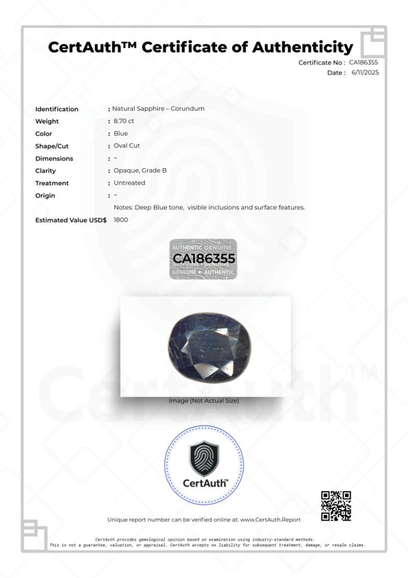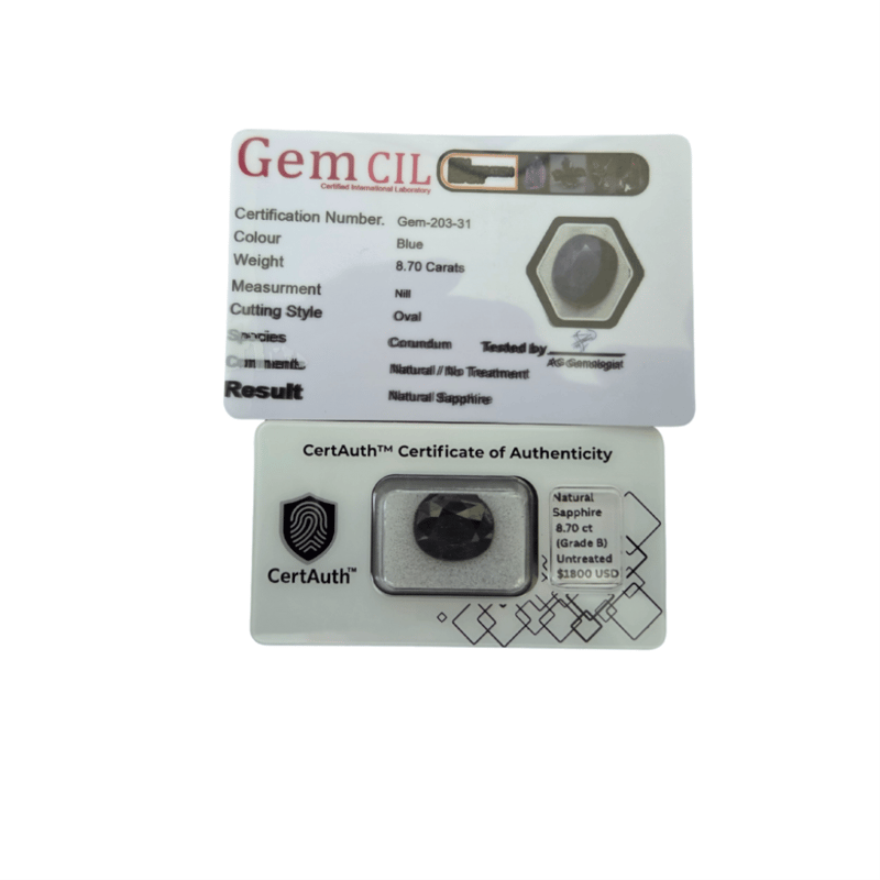 NATURAL BLUE SAPPHIRE – 8.70CT, CERTIFIED BY CERTAUTH™