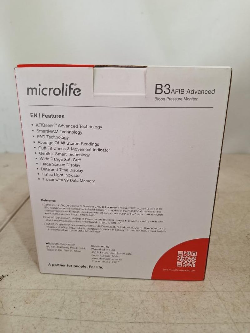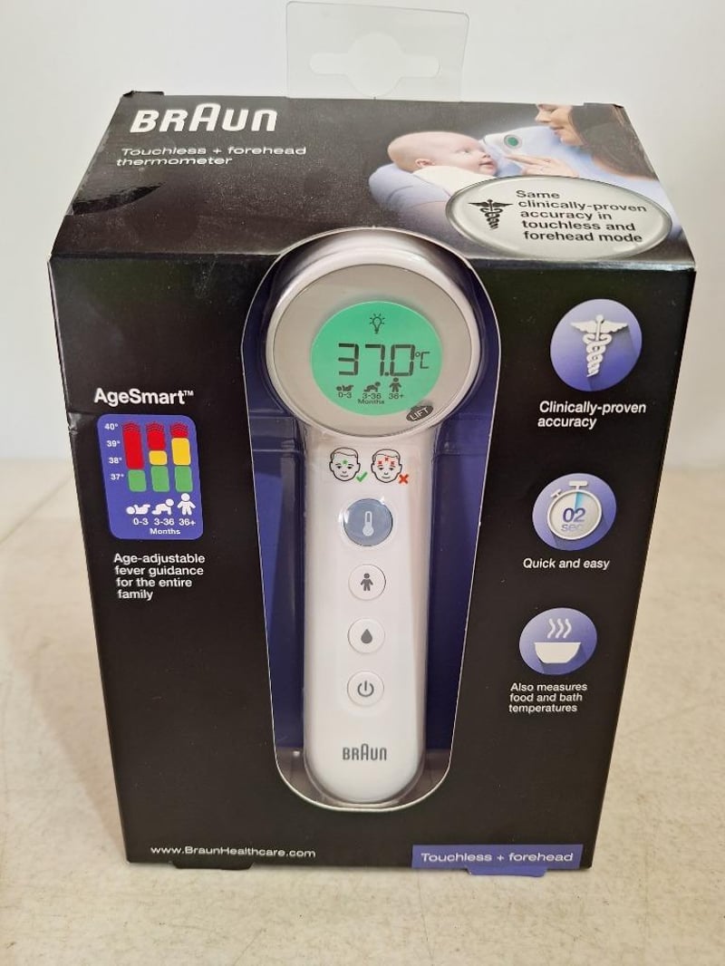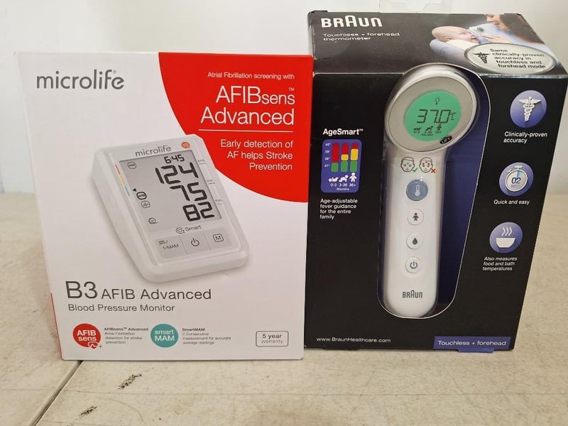 1 x MICROLIFE B3 AFIB advanced blood pressure monitor, RRP$125.99, NEW factory sealed in box, 1 x BRAUN touchless & forehead thermometer, NEW factory sealed in box
