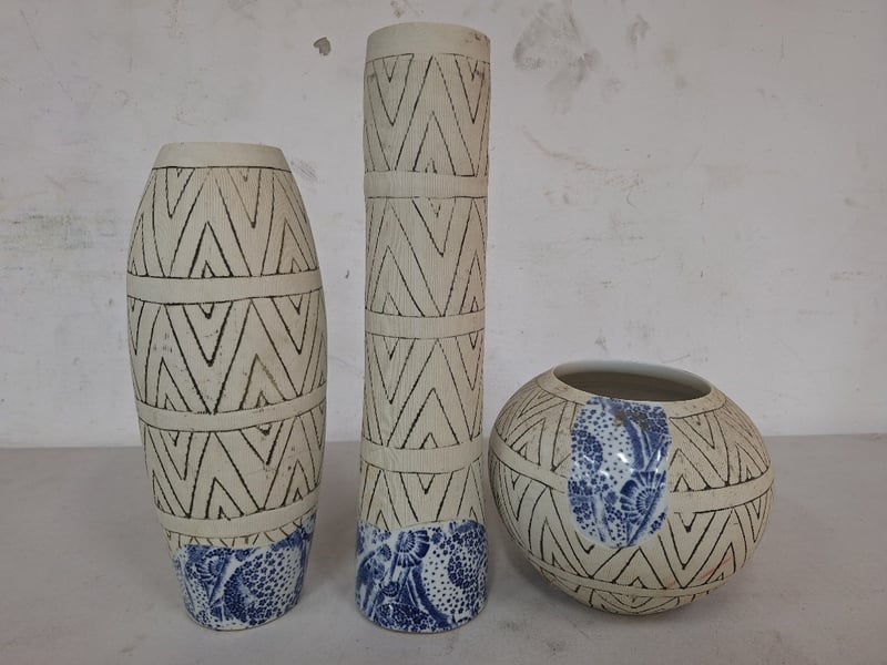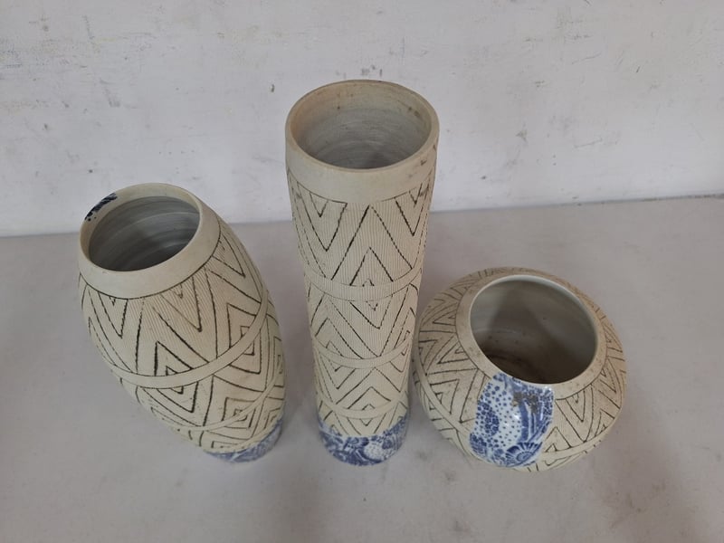 Ceramic Vases x3, Dimensions Small H:18cm W:22cm D:22cmDimensions Medium H:35cm W:14cm D:14cmDimensions Tall H:41cm W:14cm D:14cmSOLD AS LOT