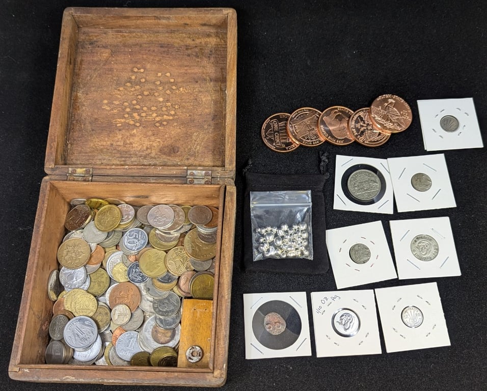 TIMBER JEWELLERY BOX WITH COLLECTION OF AUSTRALIAN, USA AND WORLD COINSIncludes 1Oz Silver Scrap, 1/10Oz Xag Silver Shilling Coin, Ancint Roman Coin, Five Usa 999 Fine Copper Coins, Various Australia Coins, Collection Of World Coins584892+150