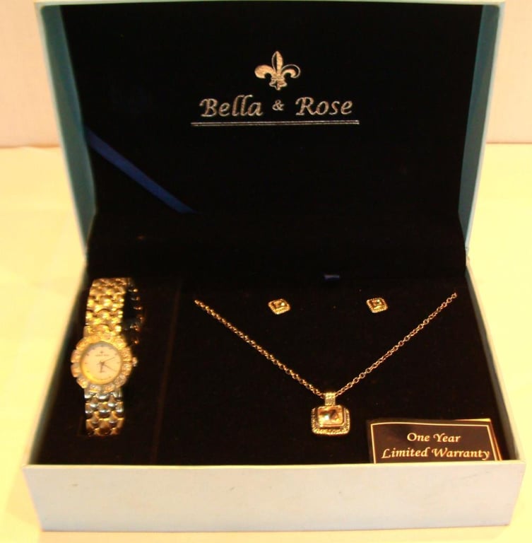 NEW BELLA & ROSE JEWELLERY SET INCUDES WATCH,PENDANT NECKLACE & EARRINGS IN GIFTBOX.586109+2