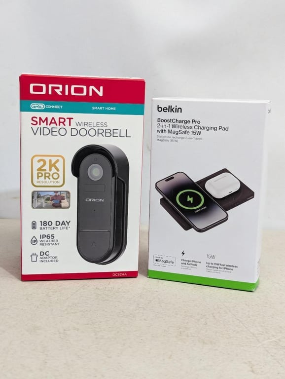 1 x BELKIN BoostCharge Pro 2-in-1 Wireless charging pad with MabSafe 15W, RRP$199.95, NEW factory sealed in box, 1 x ORION Grid Connect Smart 2K-Pro rechargable video doorbell, DC62Ha, RRP$129.00, NEW sealed in box