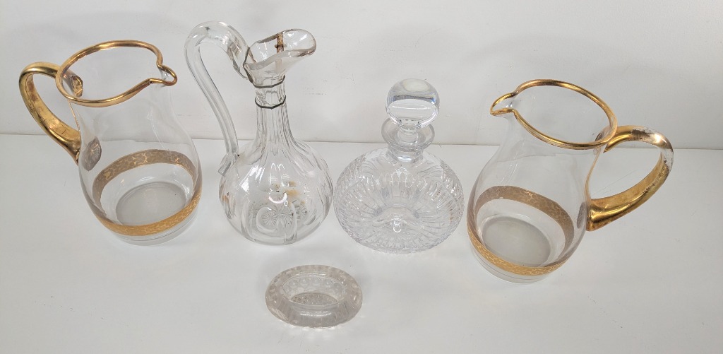 TWO JUGS, WINE CRUET, DECANTER, SALT CELLARSItem Size: Height: 27cm, Width: 15cm, Depth: 5cmTwo Glass Jugs With Gold Trim, Crystal Wine Cruet, Crystal Decanter, Crystral Salt CellarsCondition: Fair - Refer To ImagesF2C162911+4