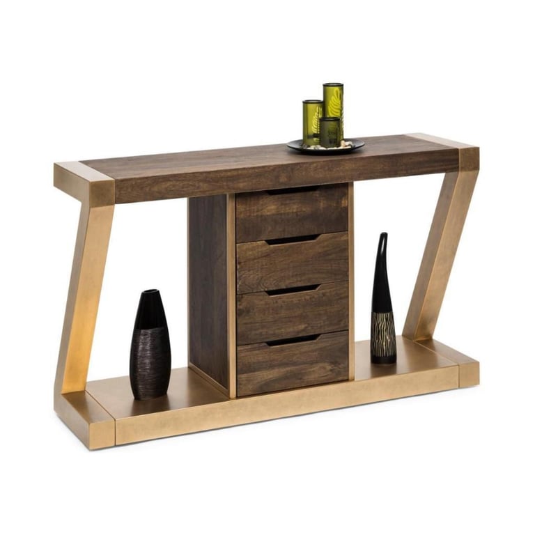 RRP $1245 Contemporary Solid Wood Iron Hallway Console Table – Brass Finish Brand New - Orignal Packaging - This Contemporary Solid Wood Iron Hallway Console Table – Brass Finish adds pure class and elegance to any Hallway, Entryway, Living Room or Lounge. The thick Wood Top makes it perfect to display all your stylish possessions, while the four drawers provide a great level of Storage to keep away all your hidden treasures. The brass finish on the frame accentuates great Contemporary appeal. - Product Dimensions (Length) 127cm (Width) 38cm (Height) 77.5cm - Middle-Opening Dimensions Drawer: (Length) 32.5cm (Width) 30.5cm (Height) 9.5cm - Product Weight 33kg - Colour Frame: French Brass | Wood: Walnut Finish - Material Details Frame: Iron | Top & Drawer Front: Wood