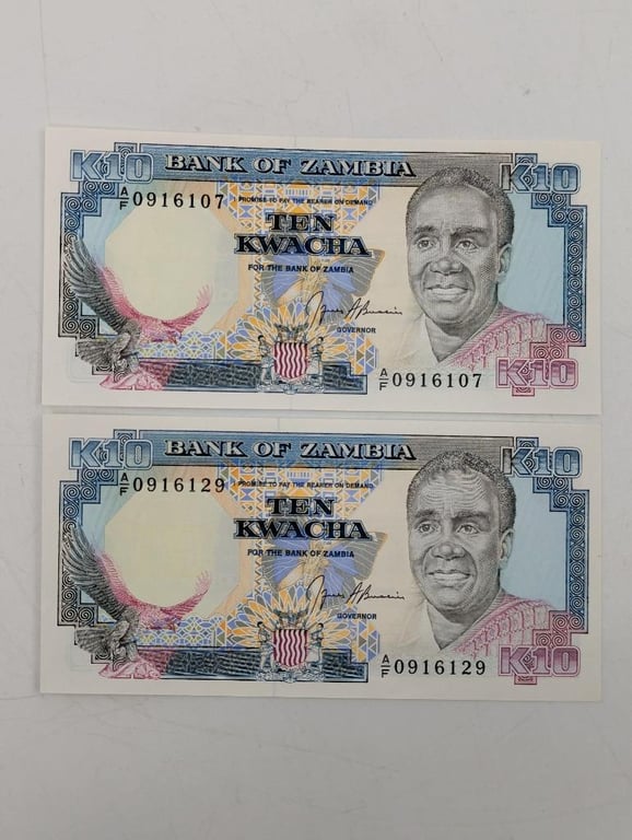 TWO ZAMBIA 10 KWACHA 1989-1991 NOTES. Condition: Uncirculated 587632+56