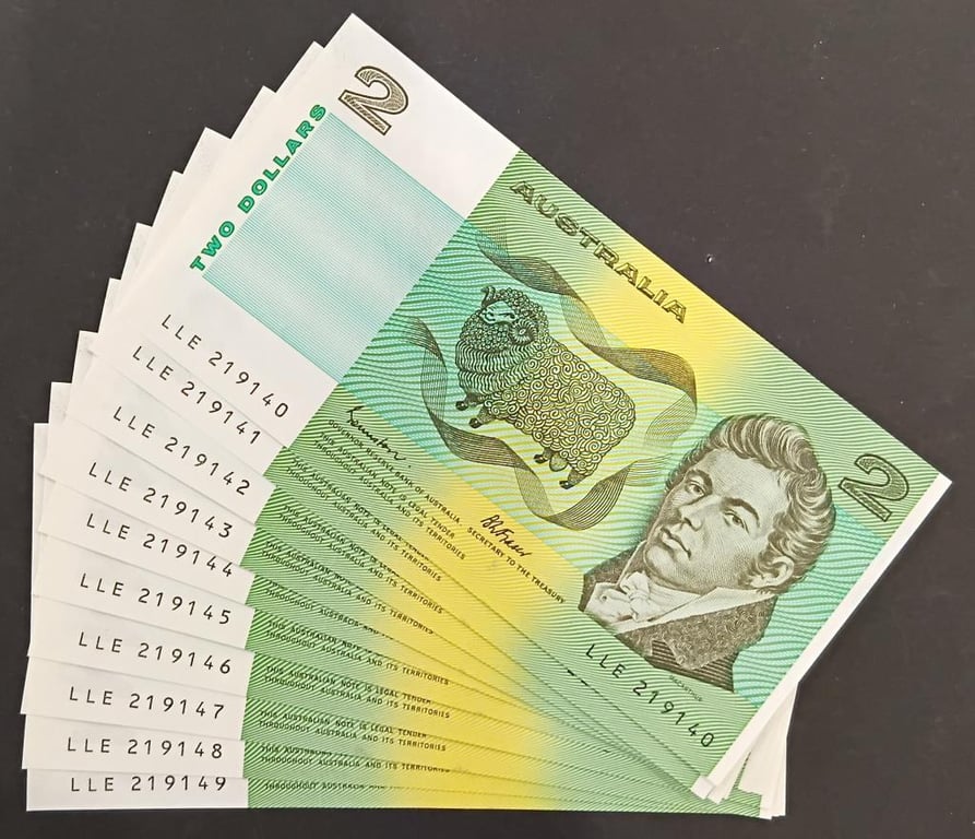 1985 10 X 2 DOLLAR NOTE CONSECUTIVE JOHNSTON FRAZER 488252+14
