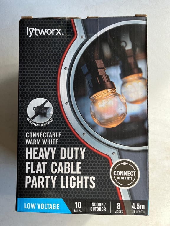 Brand New Heavy Duty Flat Cable Party Lights, Connectable, Warm White, 10 Bulb, 4.5m lit length, 8 mode